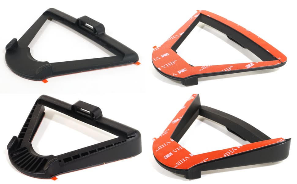 Треугольные рамки-основания, которые приклеиваются к лобовому стеклу, изготовлены из мягкого пластика. Пластик этот без труда гнется, что облегчает процесс последующего демонтажа крепления. Сам же регистратор без труда вставляется в этот треугольник и надежно удерживается в пазах.
