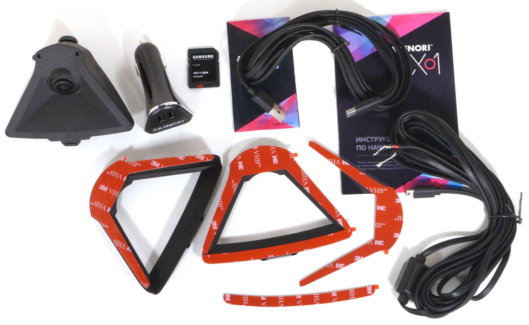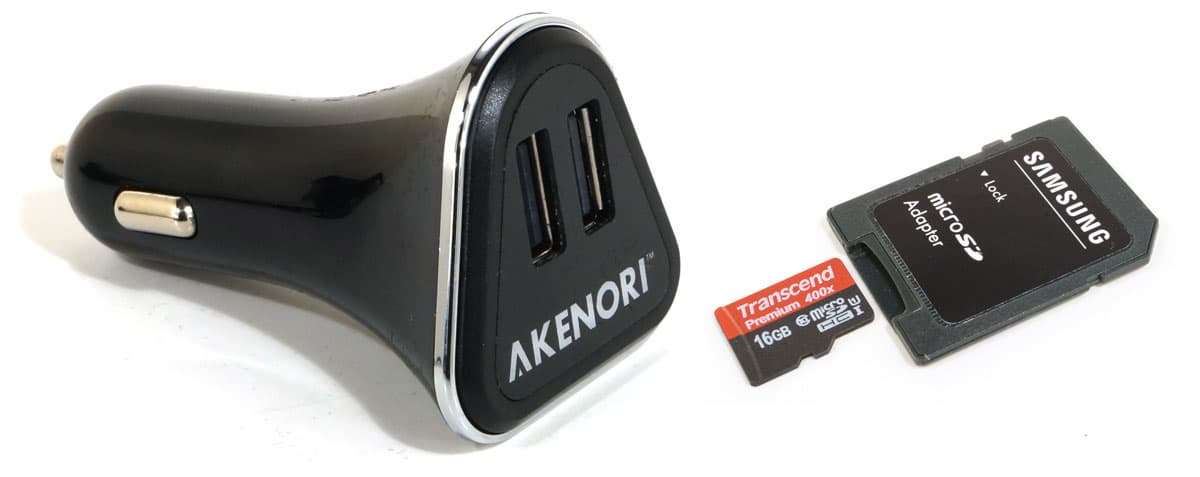 Адаптер прикуривателя Akenori работает от бортовой сети 12 или 24 вольта и дает необходимый для регистратора ток, при этом позволяя запитать еще одно устройство — смартфон, к примеру. Прилагаемая карта памяти емкостью 16 ГБ поддерживает требуемую скорость записи. Правда, такого объема хватит ненадолго: если запись ведется с максимальными настройками, то имеющееся 16-гигабайтное хранилище заполнится за два-три часа поездки. После этого запись не прекратится, она продолжится, но будет вестись за счет места, освобождаемого старыми записями, которые будут удаляться.