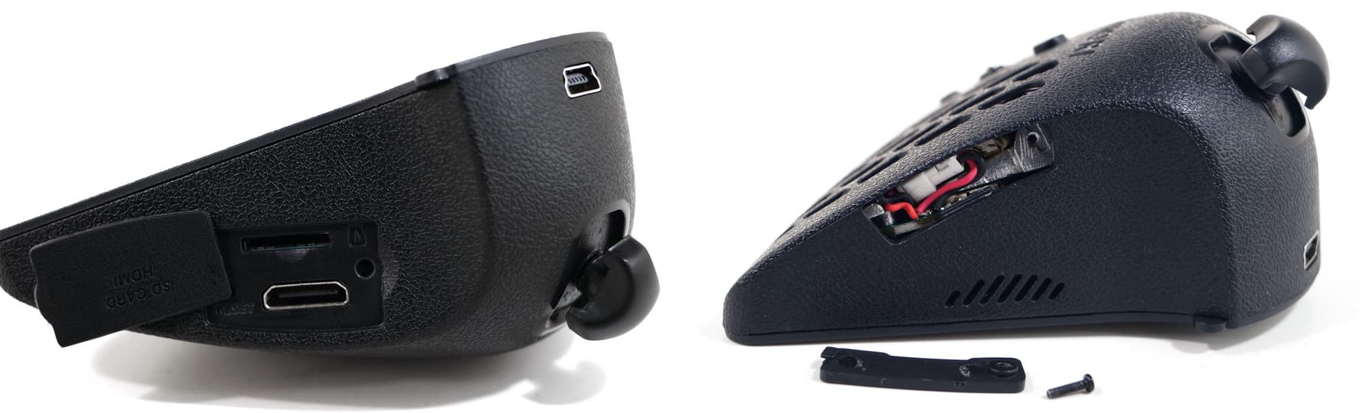 Разъемы состоят из порта HDMI и слота для карты памяти. Здесь же, под резиновой заглушкой, имеется утопленная кнопка принудительной перезагрузки устройства. А вот расшифровать спрятанное под дверцей на болтике — сложнее. Что-то технологическое для сервисного обслуживания, видимо.