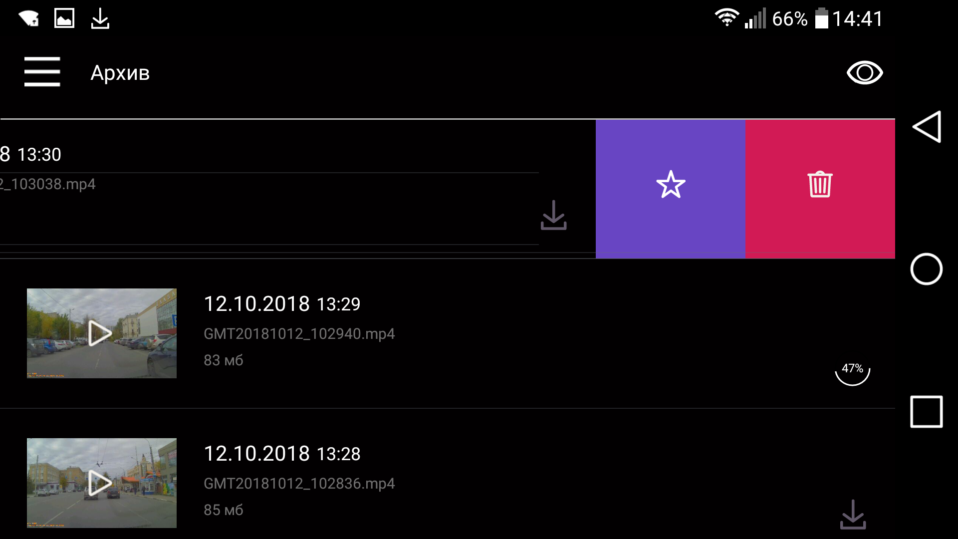Работа с архивом заключается в возможности просмотра роликов, имеющихся на карте памяти. Во встроенном файловом браузере отображаются миниатюры этих роликов, что помогает ориентироваться при поиске нужного материала. К сожалению, прямое воспроизведение роликов при удаленном подключении невозможно — для того, чтобы просмотреть какое-то видеособытие, записанное регистратором, нужно прежде скачать на смартфон выбранный ролик и лишь теперь он будет доступен для использования. Причем скачивать разрешается ролики по одному — пакетной загрузки не предусмотрено. Не очень-то удобный способ, ведь загрузка на смартфон одного минутного ролика объемом 90 мегабайт занимает почти минуту. А если ролик был выбран не тот, который требовался, то придется повторить попытку, что снова займет минуту.