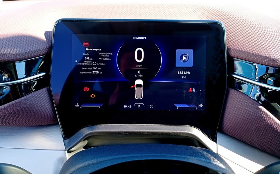 Гаджет приборной панели как бы «утоплен» в обшивку передней панели и имеет диагональ 8 дюймов, поэтому его можно считать не большим и не маленьким. Он отличается хорошим цветосочетанием, но поменять картинку не получится (подложка либо темная, либо светлая). Безальтернативно перед вашими глазами всегда будут крупные цифры скорости и полезная «мелочь» вокруг (запас хода, общий пробег, текущий и средний расход/запас топлива, FM-станция). Кому-то, возможно, была бы ближе имитация стрелочных приборов, но и ее нет. Зато, как сказали раньше, есть возможность дублирования скорости на лобовое стекло в виде проекции. Столь важные для некоторых водителей показания тахометра также невелики по размеру, но хорошо еще, что их разместили под индикатором скорости, то есть по центру. Ну и можно видеть текущую передачу — эта пиктограмма в самом низу приборного щитка.