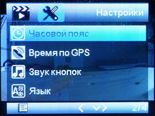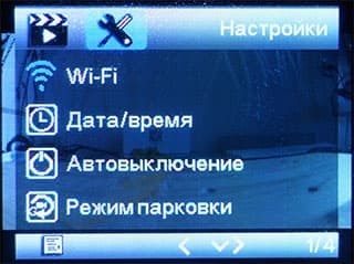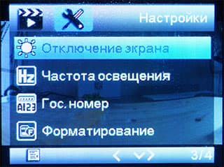 В системных настройках изменяется время выключения экрана, активируется режим парковки, определяется частота электросети региона, а также вводится пользовательский текст, который будет впечатываться в кадр вместе с другими данными.