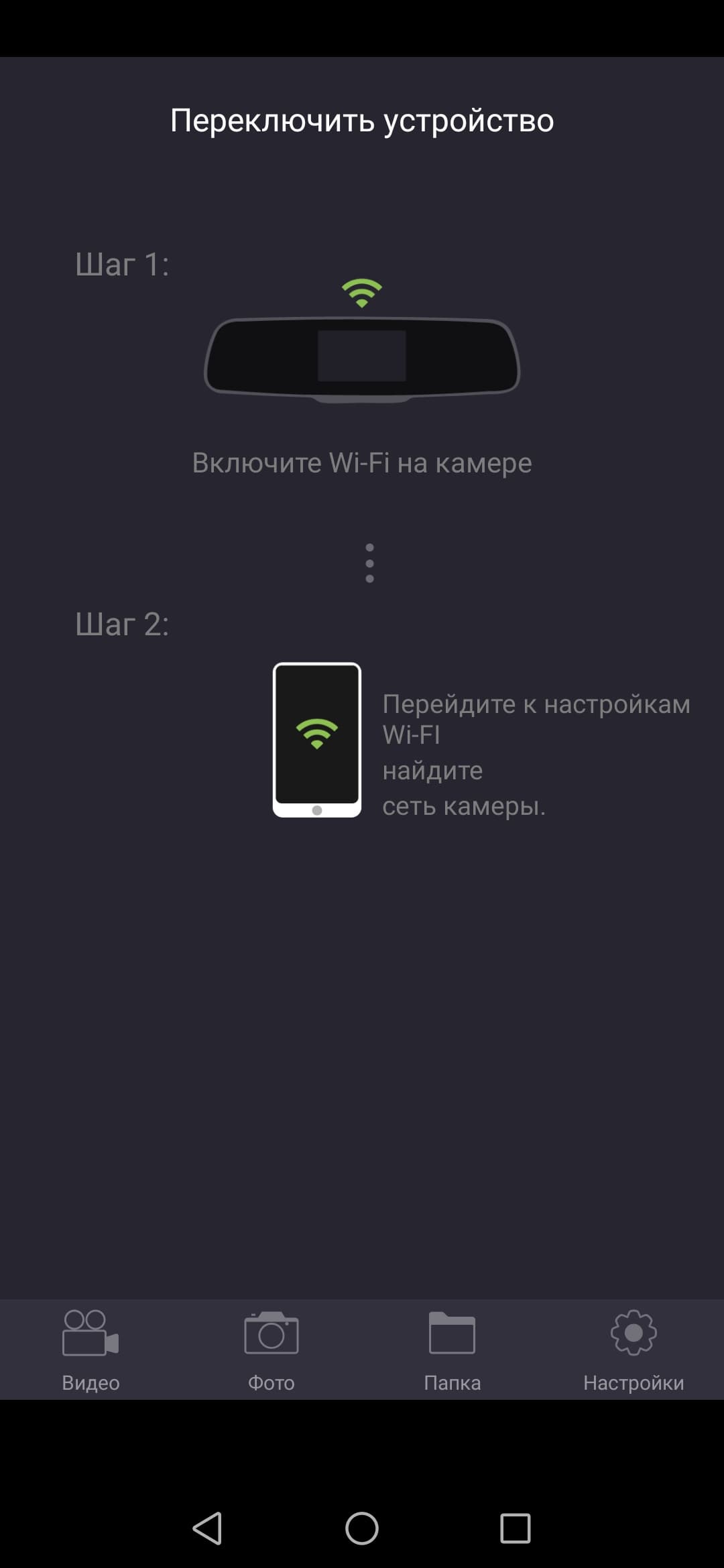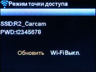 - Активация Wi-Fi адаптера в регистраторе (выбор соответствующего пункта меню либо длительное нажатие кнопки включения)