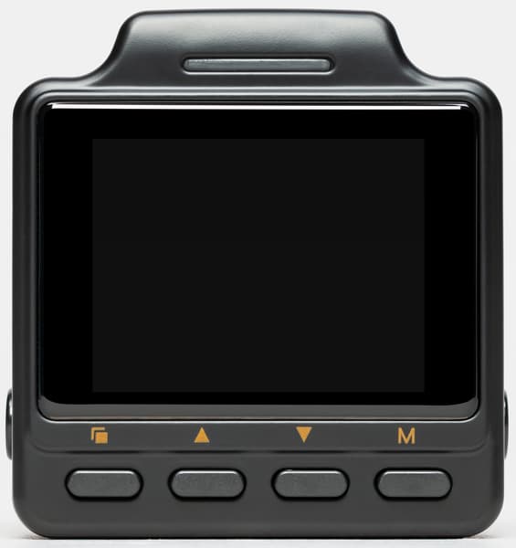 На лицевой стороне корпуса можно видеть решетку встроенного динамика, он негромкий. Задняя часть отдана дисплею и четырем кнопкам управления, рядом с которыми напечатаны разъясняющие пиктограммы. Над дисплеем расположен неярка двухцветная светодиодная полоска, отображающая текущий режим работы регистратора.