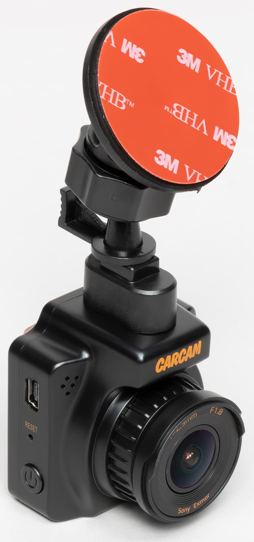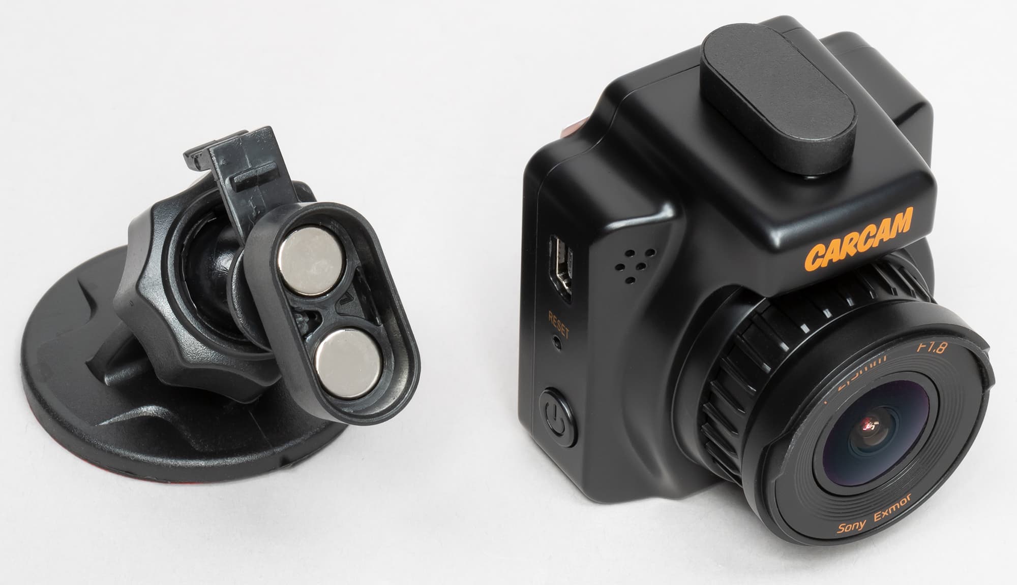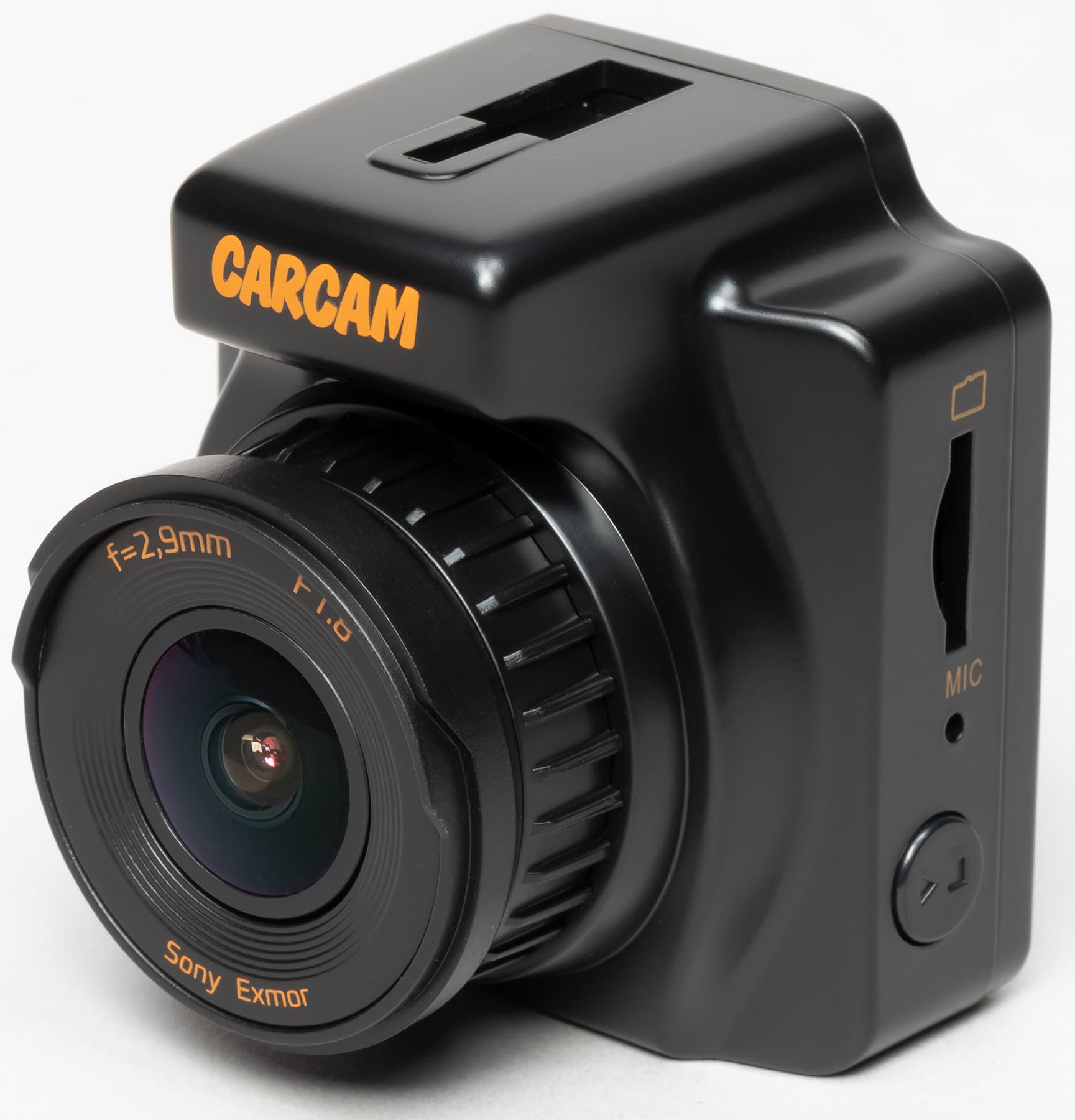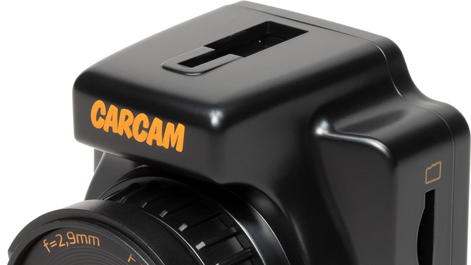 В сравнении со стационарным штатным регистратором рассматриваемый прибор практически незаметен снаружи. Разглядеть можно лишь оранжевый лейбл Carcam, напечатанный на передней части корпуса.