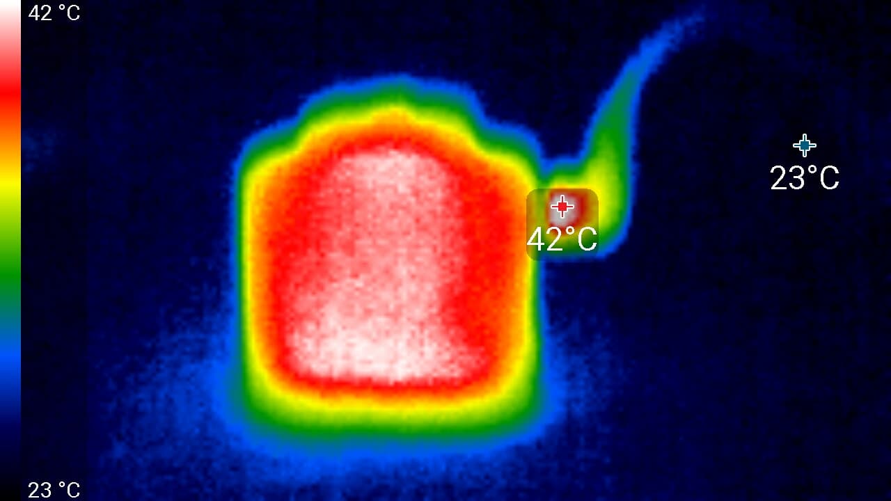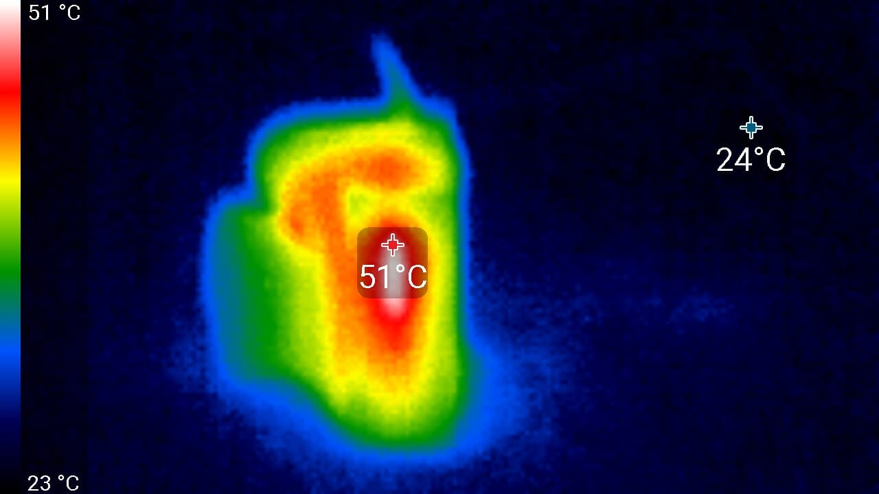 Во время длительной работы корпус аппарата нагревается незначительно, присутствуют лишь локальные участки с явным перегревом. Ниже приведены тепловизионные снимки прибора, сделанные после часа беспрерывной видеозаписи с работающим дисплеем. Питание регистратору подавалось стационарное, тестирование проводилось в комнатных условиях при температуре окружающего воздуха около 25 °C.