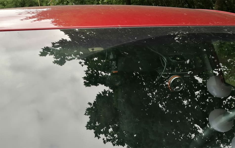 Крепить регистратор на лобовое стекло рекомендуется в районе зеркала заднего вида. В нашем случае оптимальным местом для установки оказался верхний край лобового стекла справа от зеркала заднего вида, поскольку место на стекле непосредственно за зеркалом уже занято, там находится стационарный, установленный еще в автосервисе, двухкамерный регистратор.