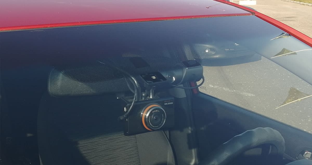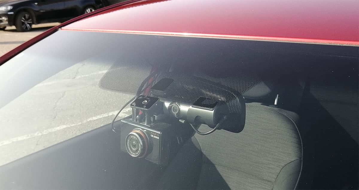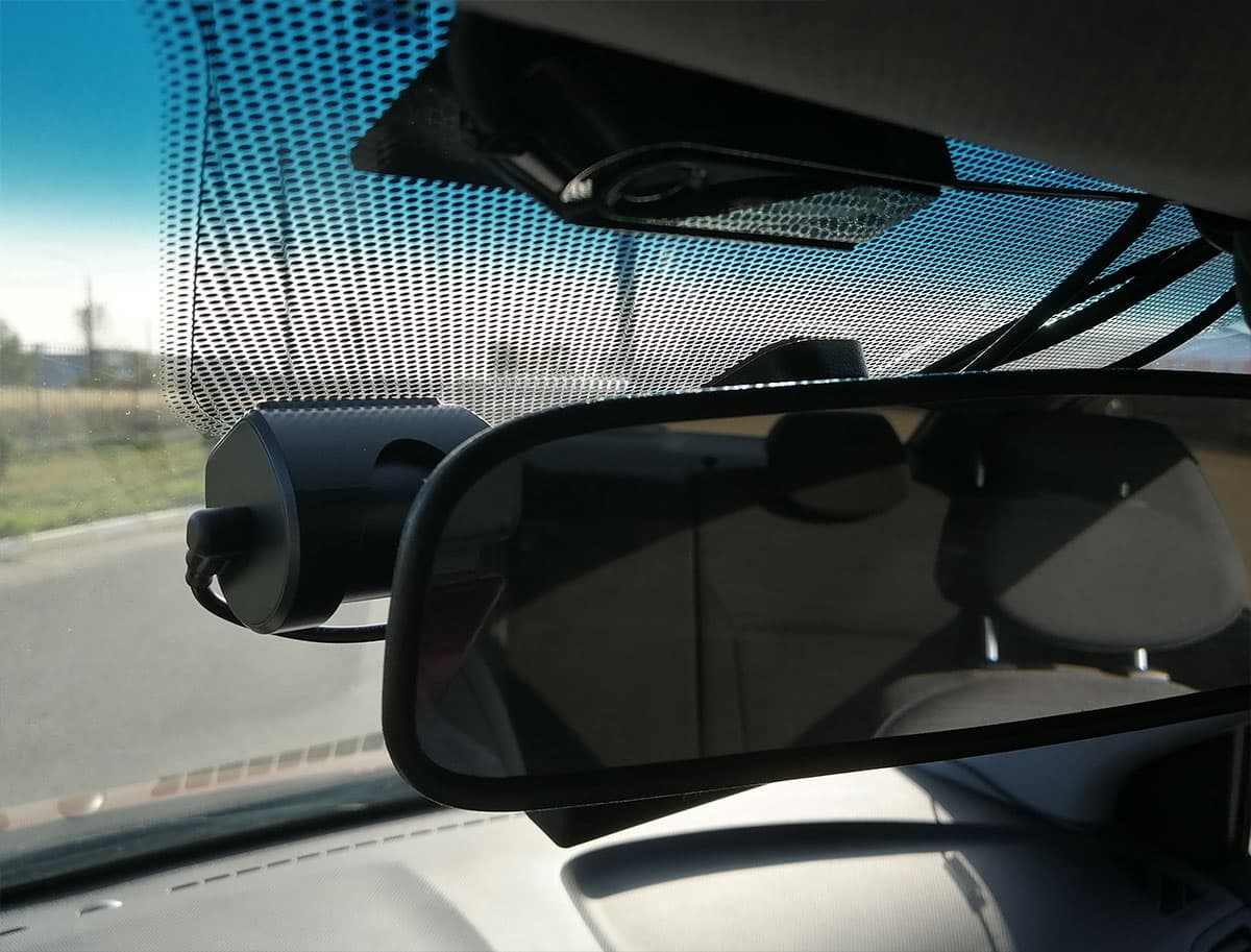 В нашем случае оптимальным местом для установки оказался верхний край лобового стекла чуть левее центральной опоры зеркала заднего вида, поскольку место на стекле непосредственно за зеркалом уже занято, там находится стационарный, установленный еще в автосервисе, двухкамерный регистратор.