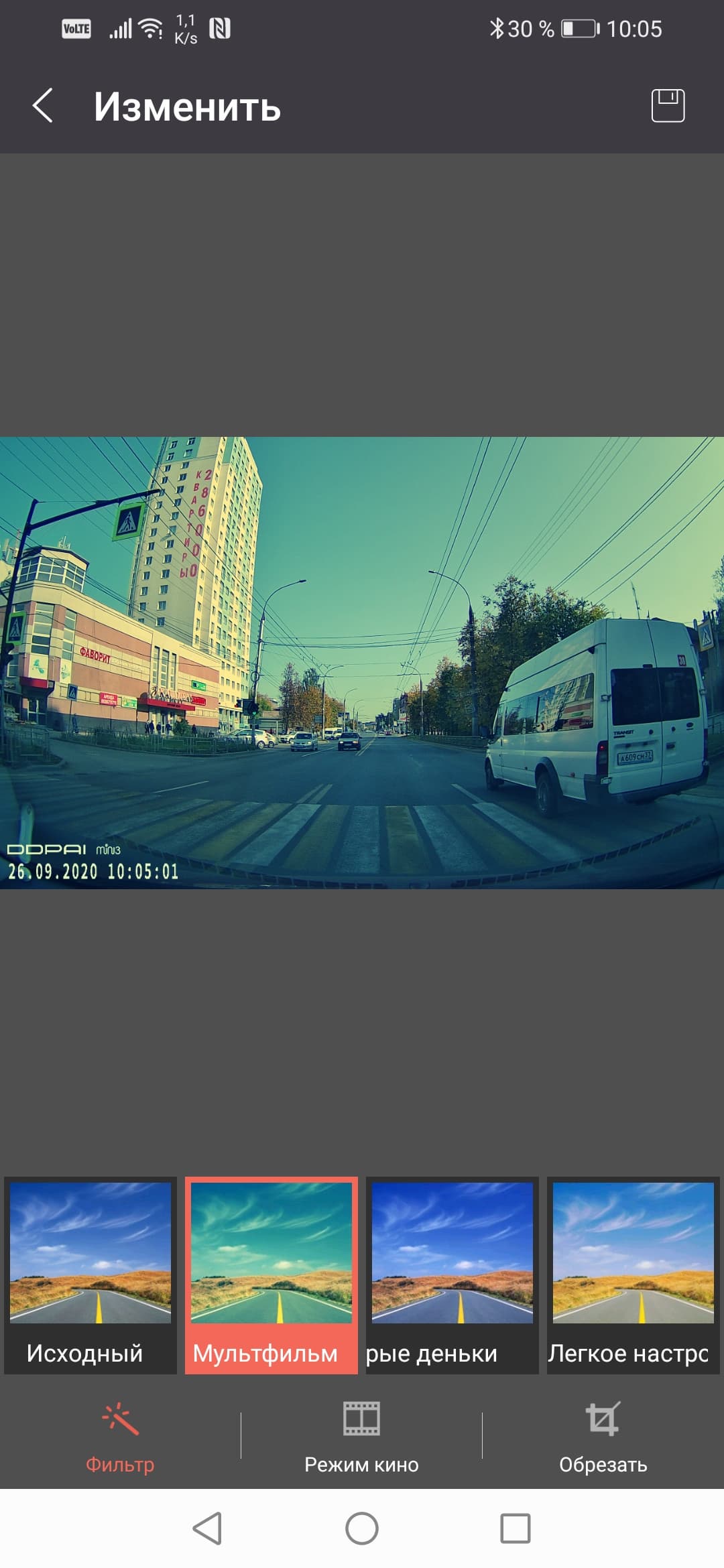 Есть в приложении забавные (читай — ненужные) функции. например, функция Моя поездка. Она заключается в том, что регистратор постоянно ведет запись лога каждой поездки (каждого включения), отмечая аварийные ускорения, торможения и развороты. Но, поскольку регистратор тестировался в обычном автомобиле, не гоночном, все эти пункты остались пустыми. Также приложение позволяет отредактировать любой видеоролик: обрезать, наложить инстаграмоподобный фильтр и т. д.