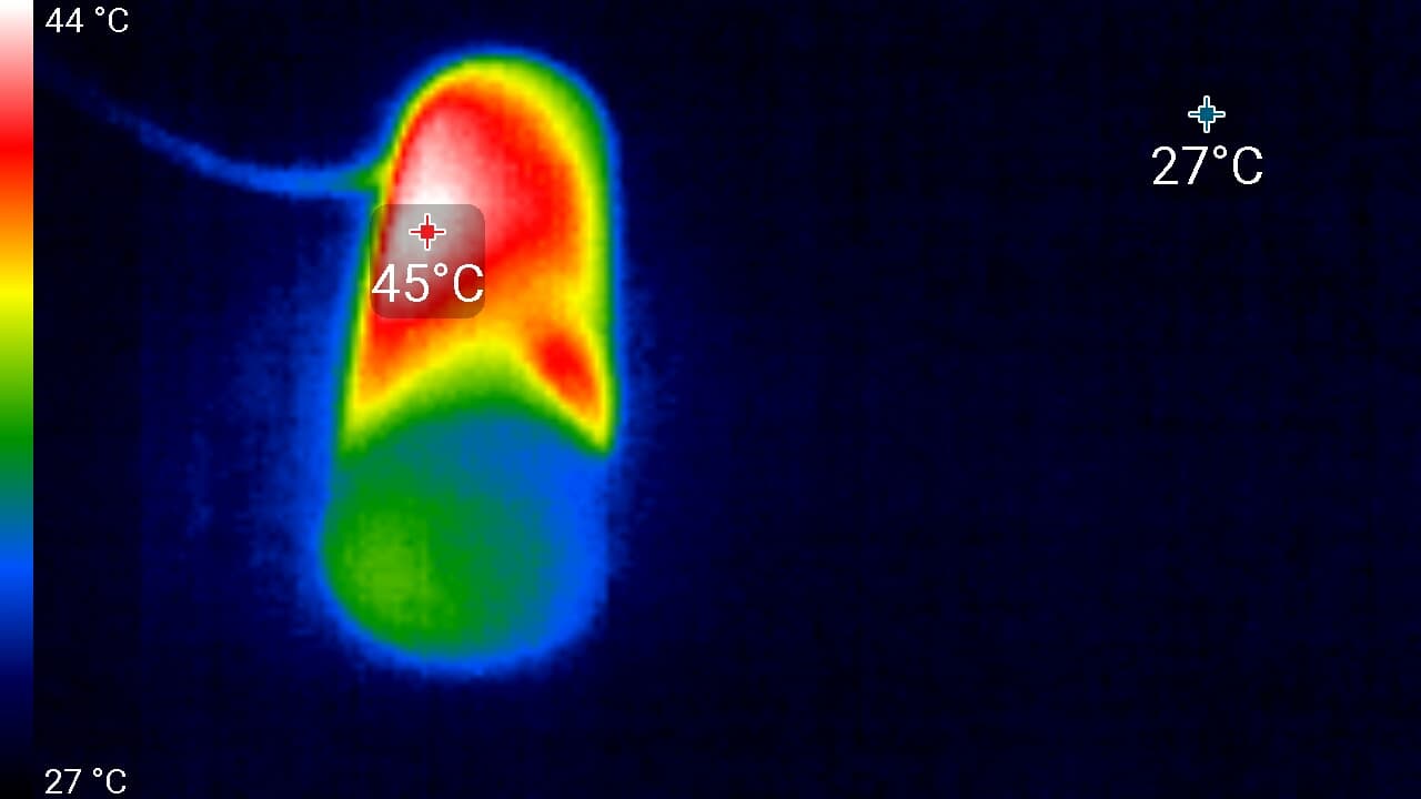 На снимках видно, что разработчики зря не предусмотрели вентиляционные отверстия в корпусе аппарата. Кое-где температура корпуса достигает 45 °C. Казалось бы, не опасно. Однако регистратор ведь крепится на лобовое стекло автомобиля, на самом солнцепеке. И при выключенном кондиционере, который обдувает зону крепления регистратора, аппарат рискует получить аварийный перегрев.
