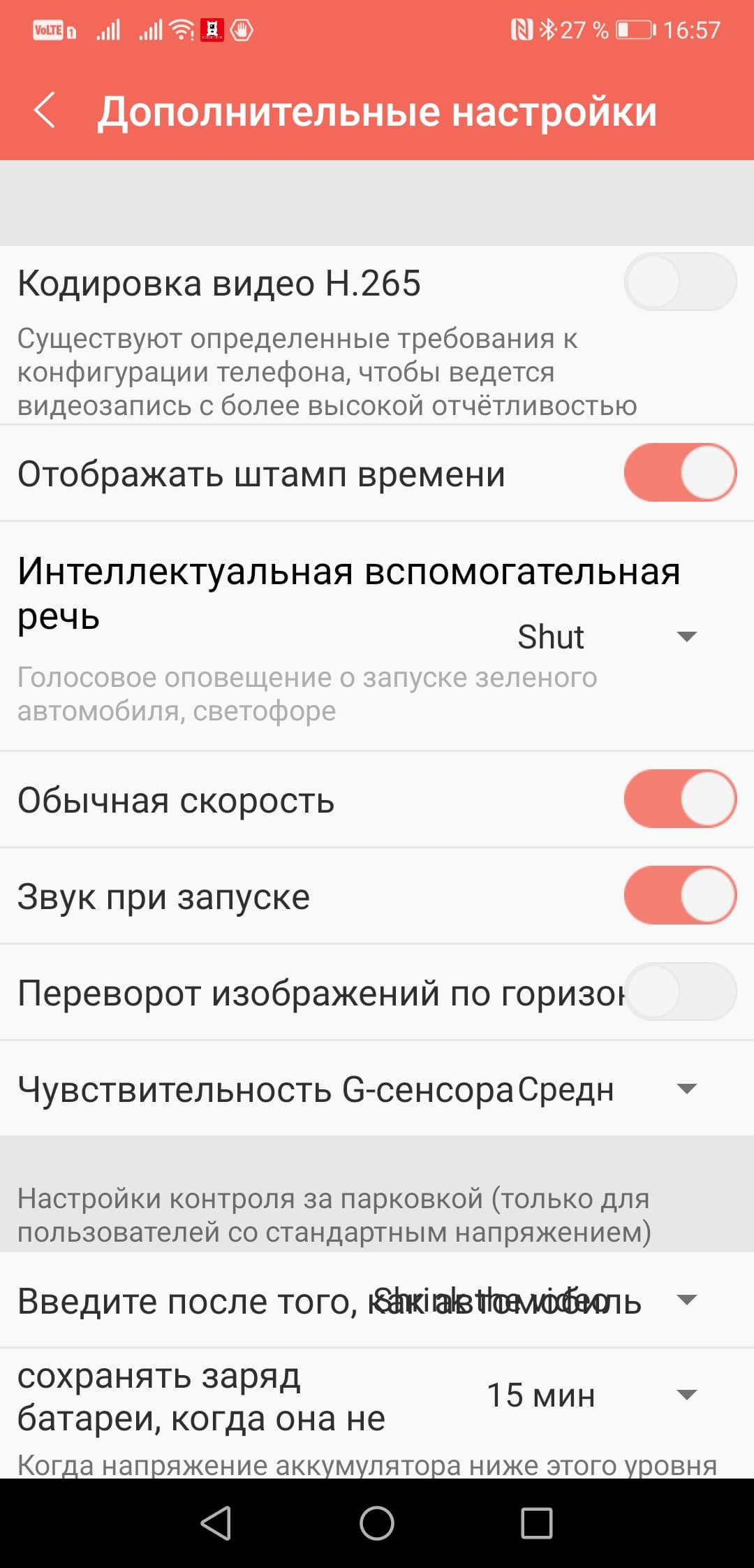 Это как раз яркий пример того, что программа делает с русским языком: «чтобы ведется видеозапись», «запуск зеленого автомобиля», «сохранять заряд батареи, когда она не», кнопки, налезающие на текст, и так далее. Или например, настройка «обычная скорость». Это вообще про что? Нет уж, лучше английский. Там тоже не все идеально, но как-то получше.