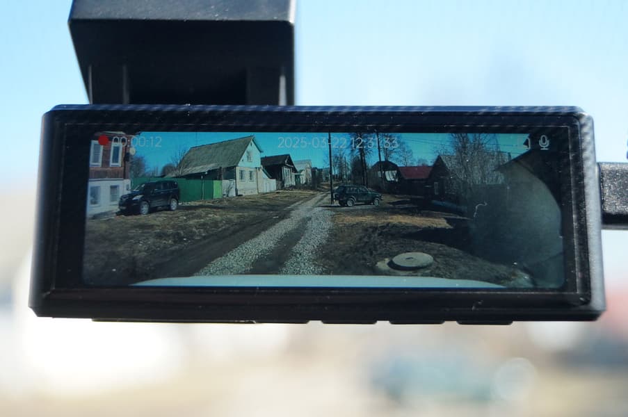 Крепление разрешает наклонять регистратор вверх-вниз, но в стороны регистратор повернуть не получится. Следовательно, разместить прибор можно только по центру лобового стекла. Ведь все стекла изогнуты, и если регистратор приклеить слева — он и будет «смотреть» влево. Вывод: лучшего места, чем под зеркалом заднего вида, не найти. Мы установили его так, чтобы он был почти скрыт за зеркалом. Ведь никакой полезной для водителя информации экран регистратора не дает, в дороге на него смотреть не нужно. А если он понадобится для изменения настроек или просмотра сделанных записей, то корпус регистратора можно чуток наклонить, и экран станет виден.