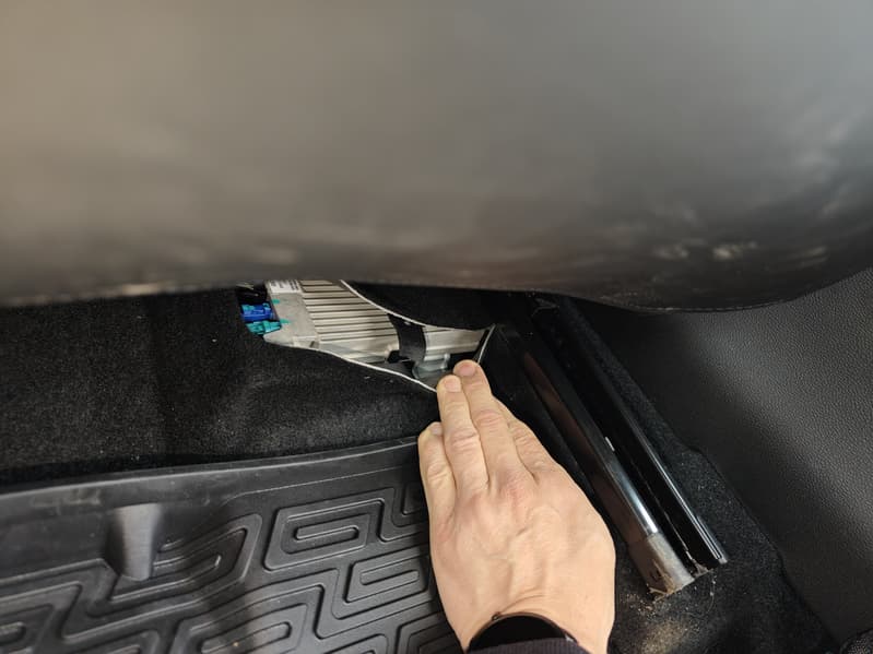 И вот тут кроется загадочное решение, смысл которого не смогли пояснить даже в Geely. Процесс установки камеры максимально неудобен и засекречен. Вы не найдёте детального описания этого процесса в руководстве пользователя. Вам будет неудобно и непонятно, зачем прятать место установки так далеко. Для того, чтобы установить маленькую micro SD-карточку, вам понадобится максимально отодвинуть переднее пассажирское кресло, отогнуть карман обшивки пола, который фиксируется на липучке, найти блок регистратора и уже на нём — небольшую заглушку. Реализация спорная по своей сути, хотя сама функция, безусловно, полезная.