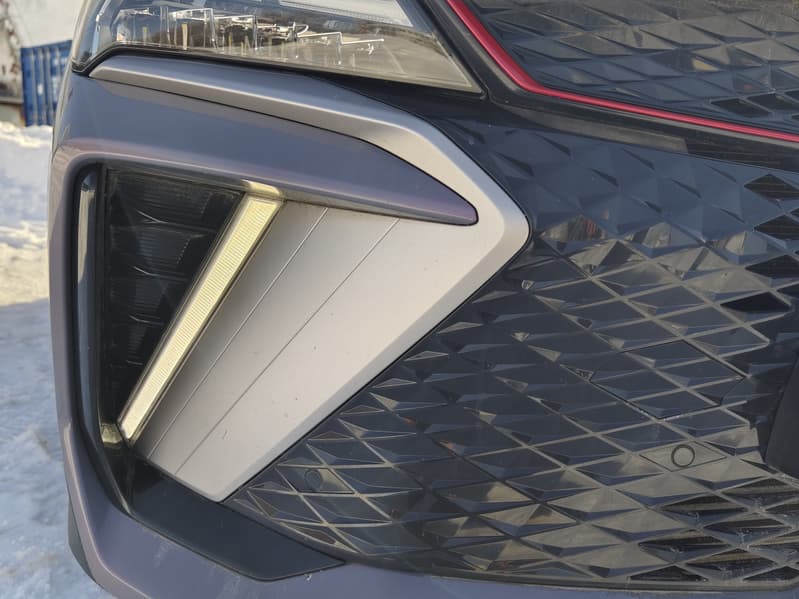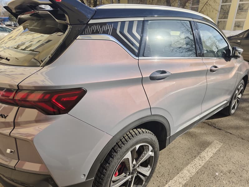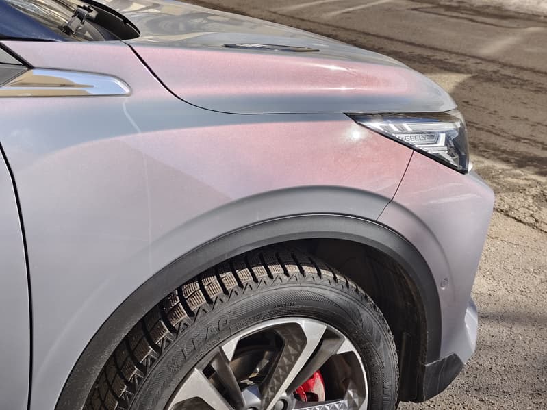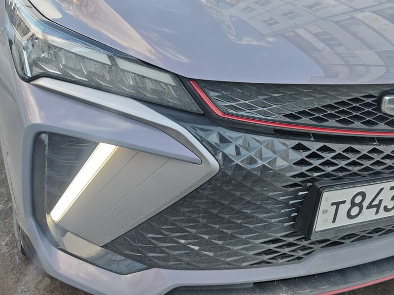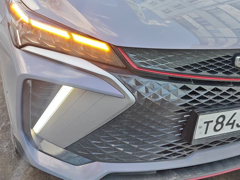 Geely Coolray — автомобиль, который привлекает внимание своим необычным дизайном. Острые фары и массивная решетка радиатора придают ему динамичный вид, а стильные вырезы на боковых панелях добавляют оригинальности.