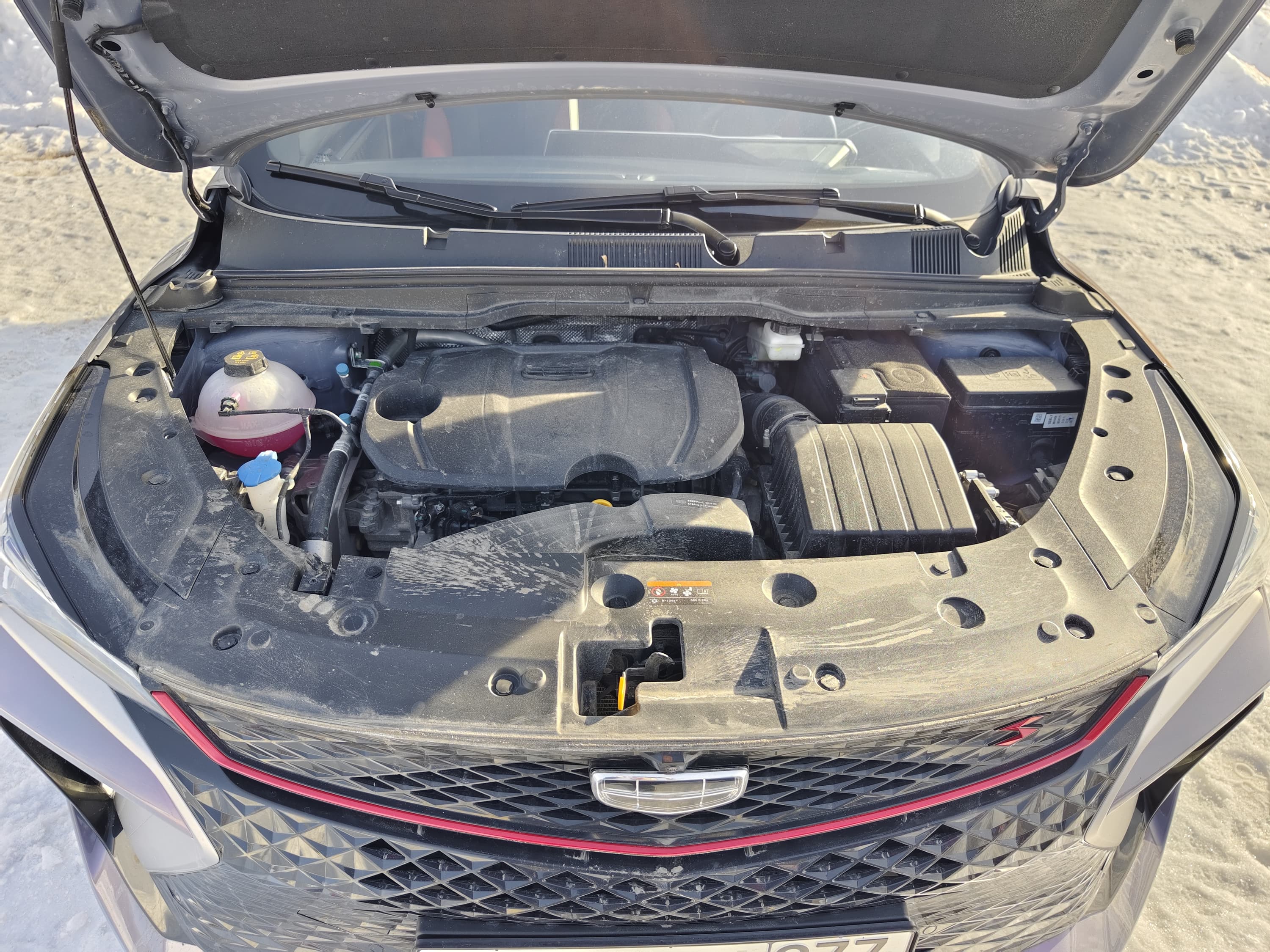 Под капотом Coolray теперь меньше декоративного пластика — и это хорошо. Но бачок омывателя всё такого же небольшого объёма, а масляный фильтр можно сменить только на подъёмнике.