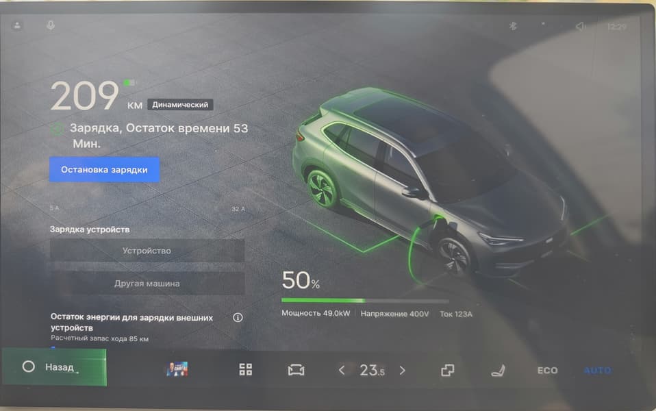 - Vehicle-to-Load (V2L): EX5 может выдавать до 3,3 кВт для питания внешних устройств (например, бытовой техники, такой как кофеварка или телевизор) через адаптер, подключаемый к зарядному порту.