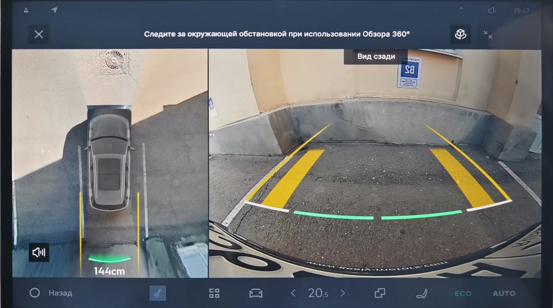 Geely EX5 оснащён системой кругового обзора 360°, которая включает несколько камер для обеспечения обзора вокруг автомобиля, помощи при парковке и работы систем безопасности.