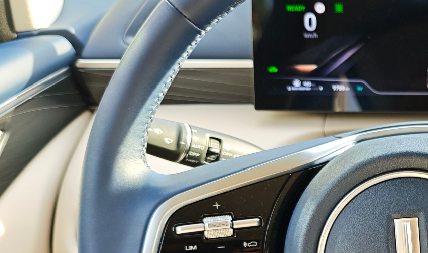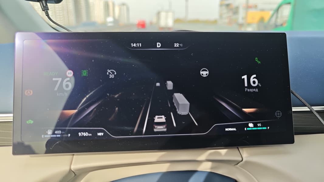 Рядом с мультимедийным экраном — цифровая приборная панель (12,3 дюйма), которая отображает данные о поездке, зарядке батареи и, окружающую обстановку с камер 360°.