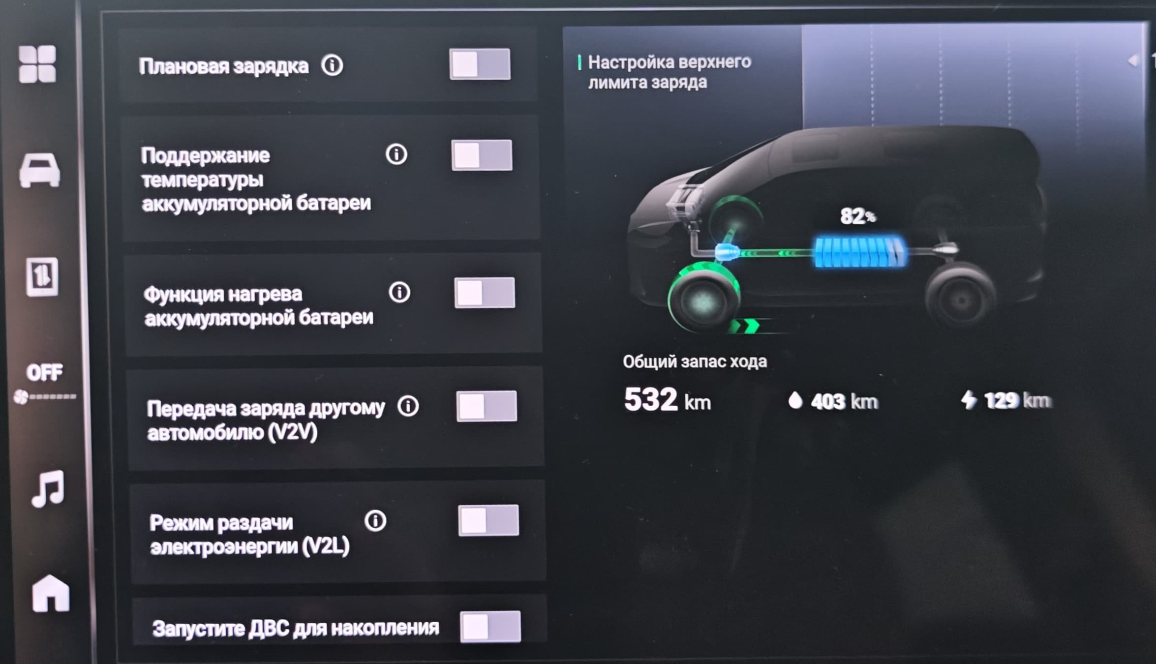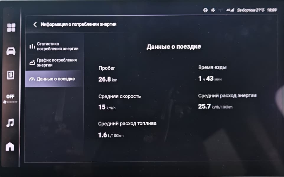 При 100% уровне заряда батареи экран мультимедийной системы информирует о прогнозируемом пробеге в 160км. По дороге в Тулу, с некоторым количеством динамичных разгонов и достаточно быстрой ездой по ЦКАД, автомобиль на электротяге проехал порядка 120 км, после чего включил генерацию от ДВС. В более спокойных городских условиях без проблем можно добиться 140.