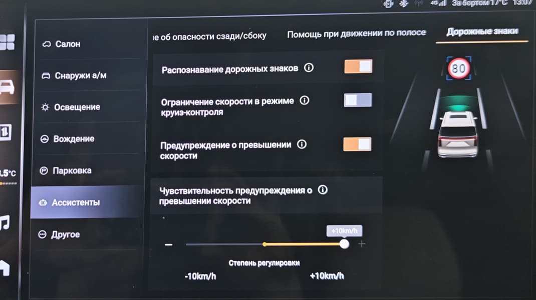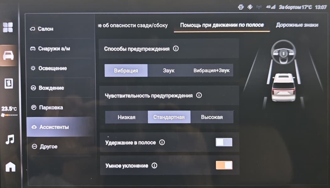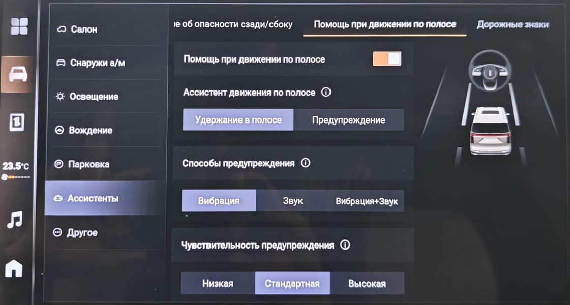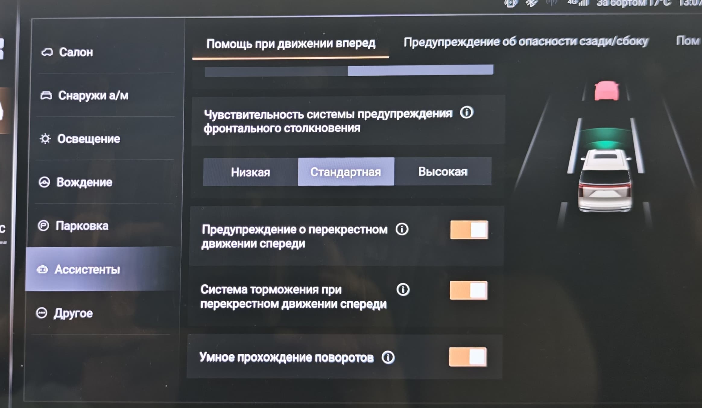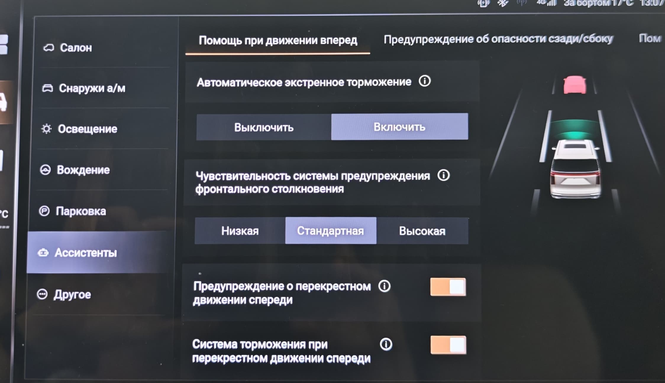 Через мультимедийный экран можно настроить и различные «помощники» водителя, такие как ассистенты при парковке, функции экстренного торможения перед препятствием, чувствительность самой системы, предупреждения об опасности сзади или сбоку, распознавание знаков, а также помощь при движении в полосе.