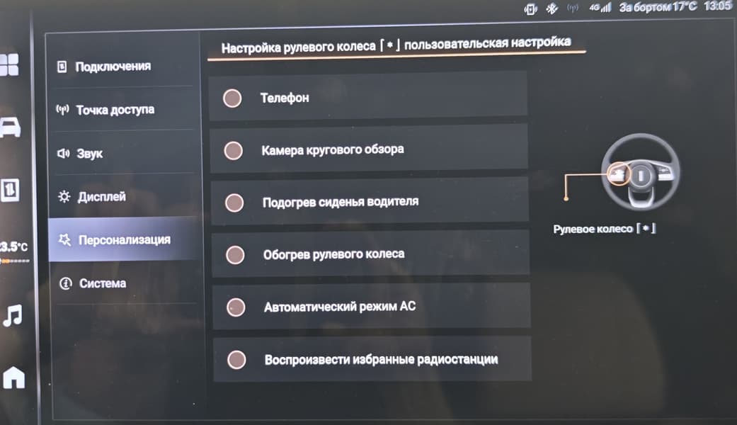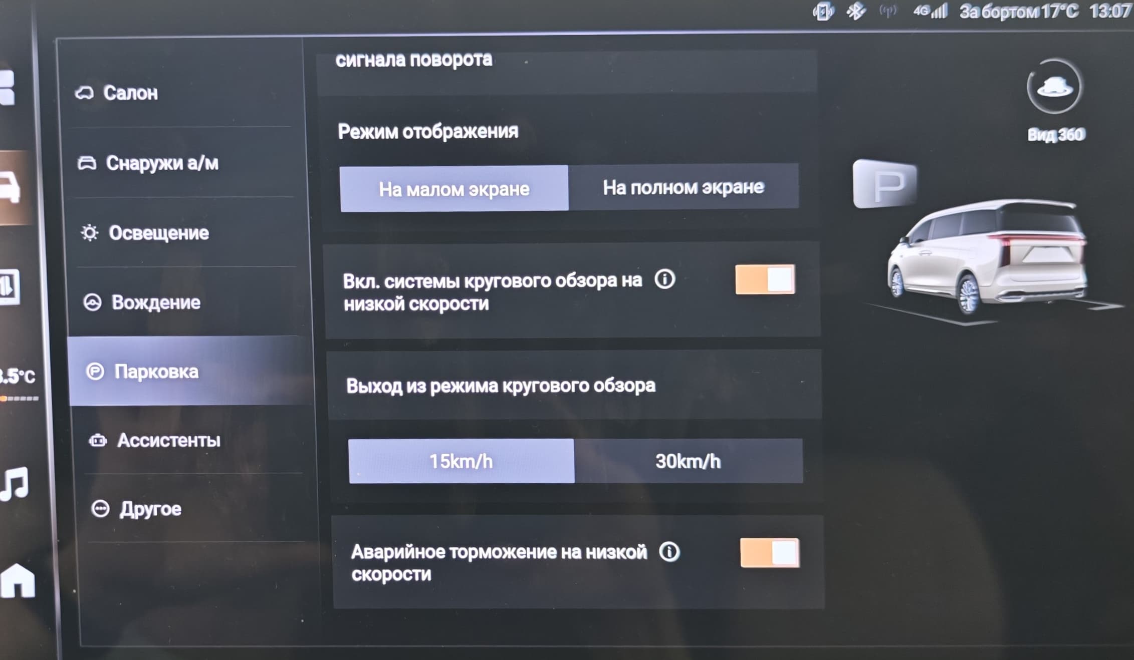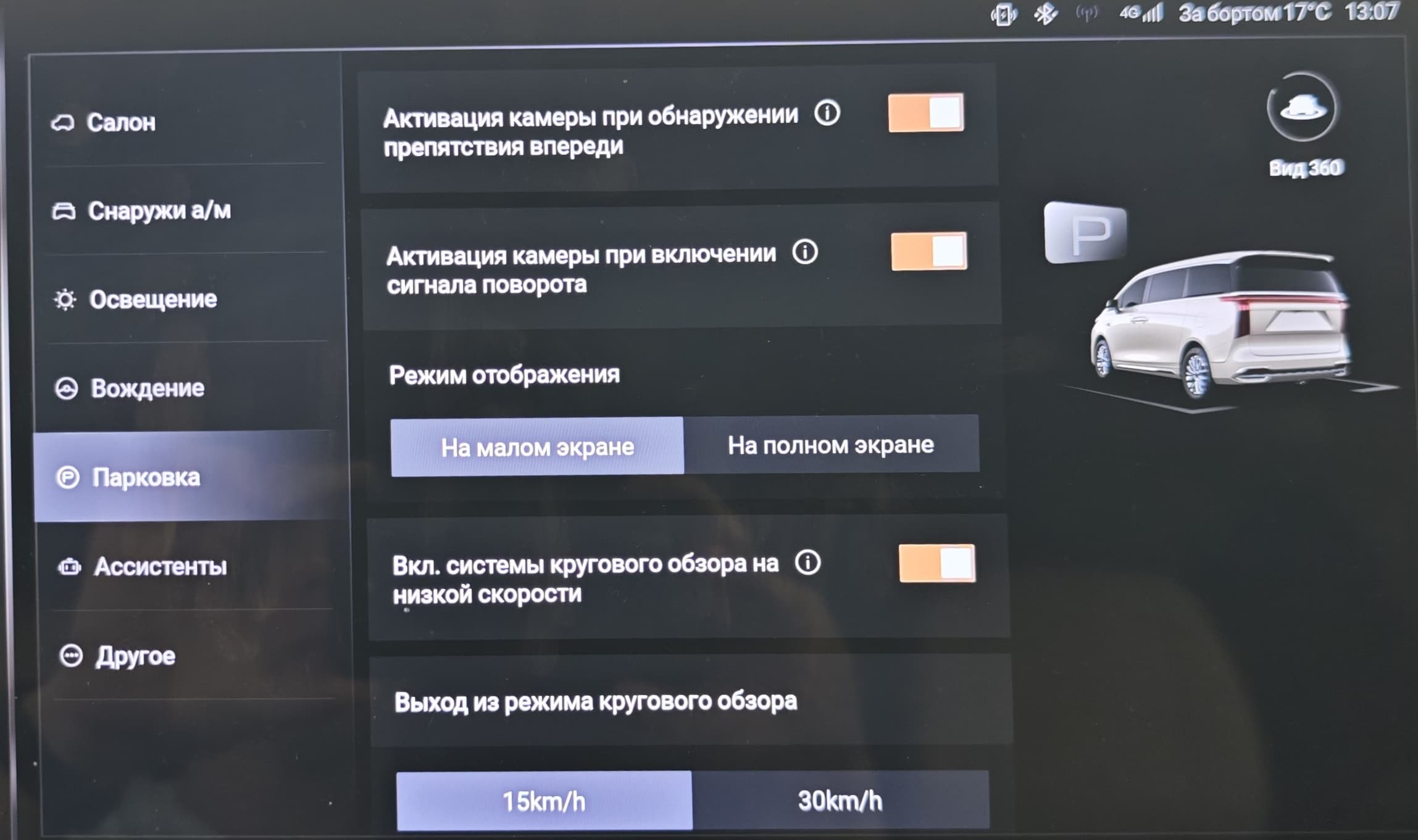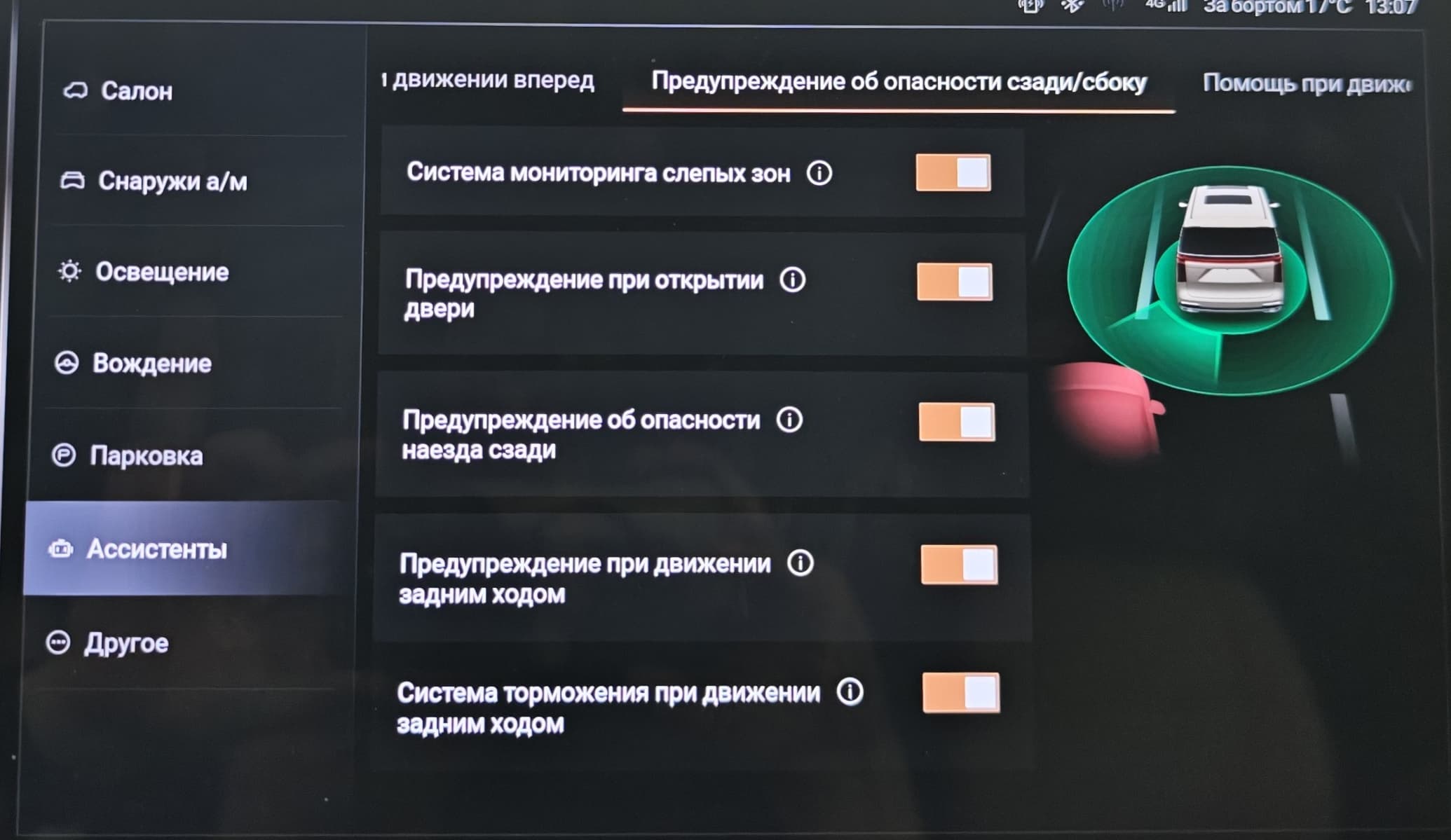 Через мультимедийный экран можно настроить и различные «помощники» водителя, такие как ассистенты при парковке, функции экстренного торможения перед препятствием, чувствительность самой системы, предупреждения об опасности сзади или сбоку, распознавание знаков, а также помощь при движении в полосе.