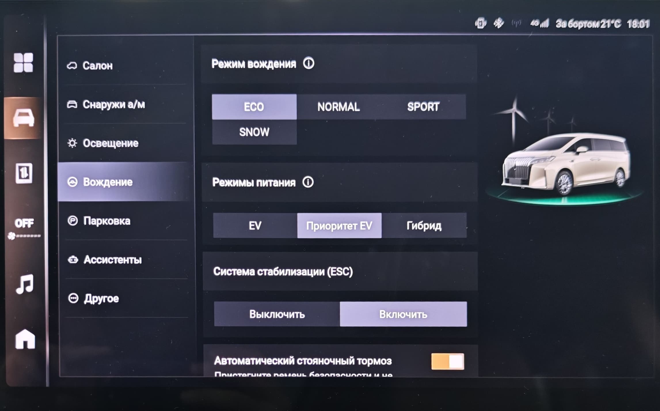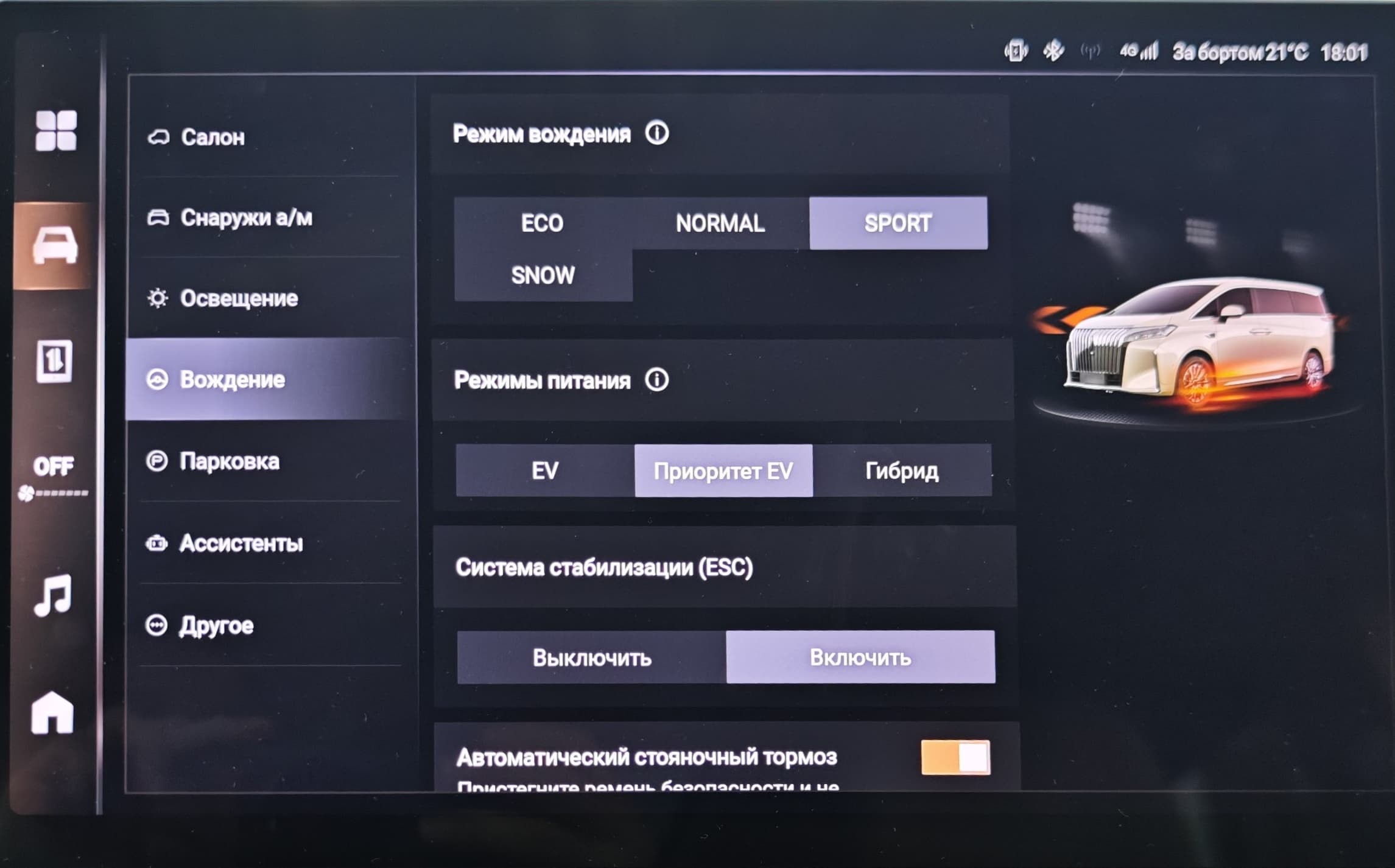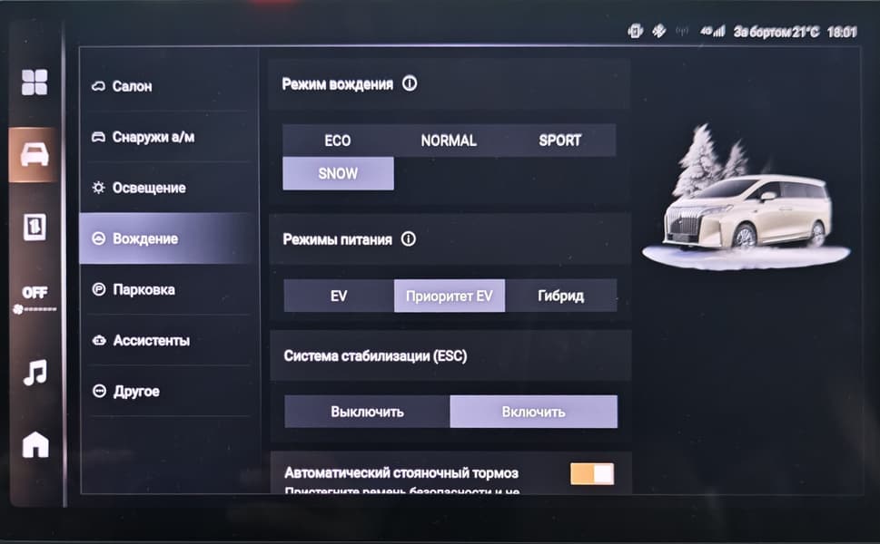 В меню ездовых режимов нет внедорожных пресетов, только стандартные Normal, Eco, Sport и дополнительно Snow.