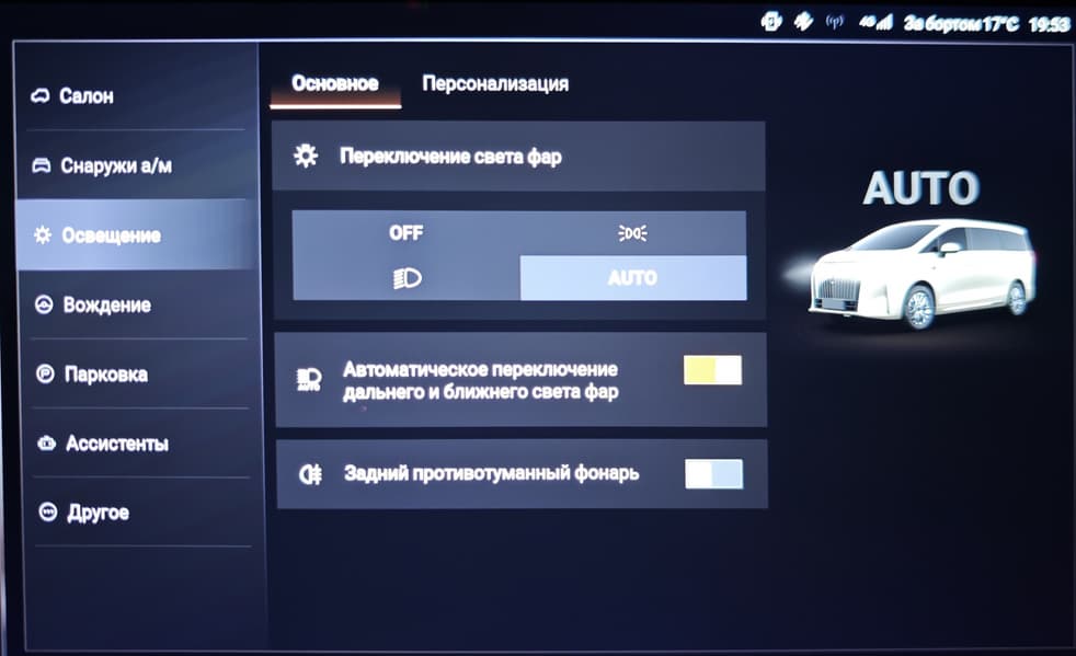 Ну что ж, слава богу, хоть «моргалки» фарами оставили на старом добром алгоритме — работает, как и раньше, без лишних заморочек. А вот всё остальное управление светом, как водится, запрятали в дебри меню. И не просто в меню, а в какой-то многоуровневый квест: сначала переходишь в «Настройки автомобиля», потом ищешь там подменю «Освещение», а уже внутри, в разделе «Основное освещение», можно наконец-то включить или выключить свет, покрутить режимы и «подшаманить» настройки.