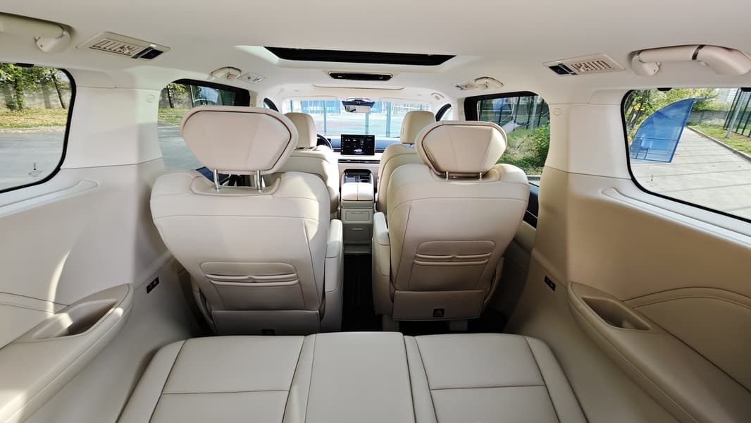 В салоне множество отсеков для хранения: от глубоких подстаканников до скрытых ниш под сиденьями. USB-порты и розетки 220V доступны на всех рядах, что делает минивэн готовым к любым задачам — от зарядки гаджетов до питания ноутбука.