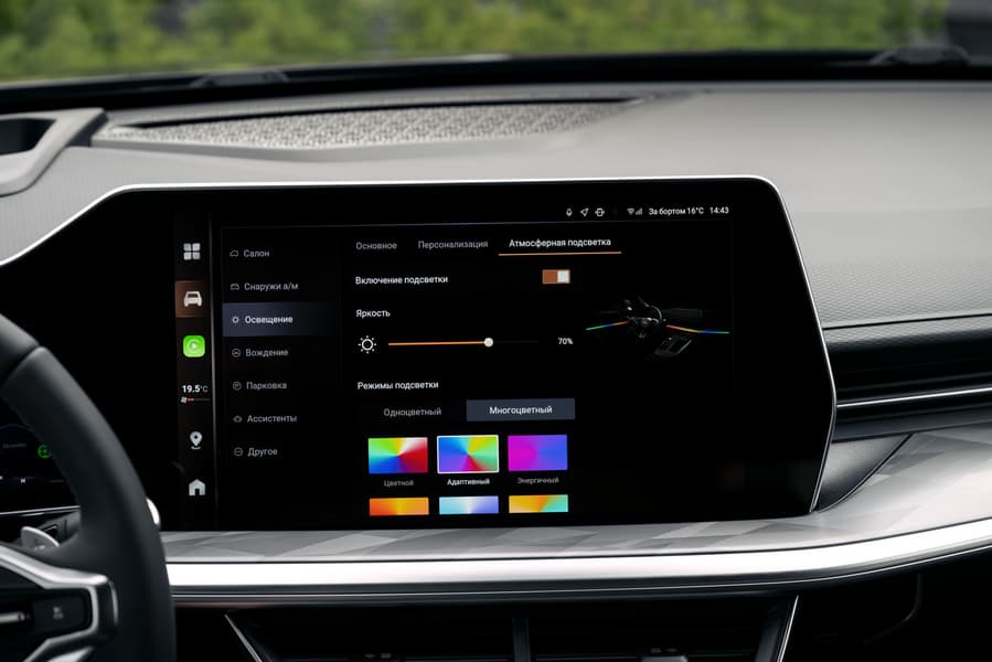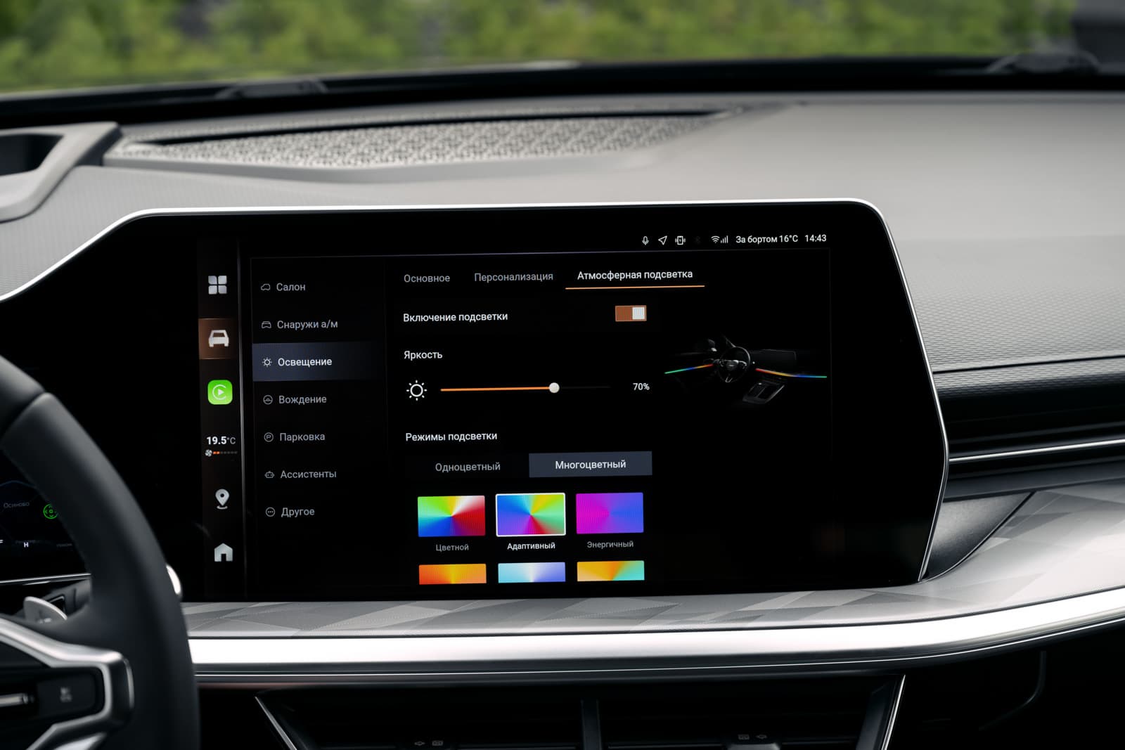 «Отсортировать» цвет, включить и выключить подсветку — эти функции зашиты в голосовое управление iFlyTek. Другой момент, что «интеллект» любит точные команды, в чем мы убедились на собственном опыте. Попросили, например, активировать подсветку на всю мощность, система, увы, не поняла смысл запрашиваемых действий. Илья Алексеев, старший специалист по интеллектуальному подключению «Хавейл Моторс Рус», заметил в беседе с нами, что в настоящее время технология находится в режиме доработки и усовершенствования, и последующие партии машин будут более понятливые и исполнительные.