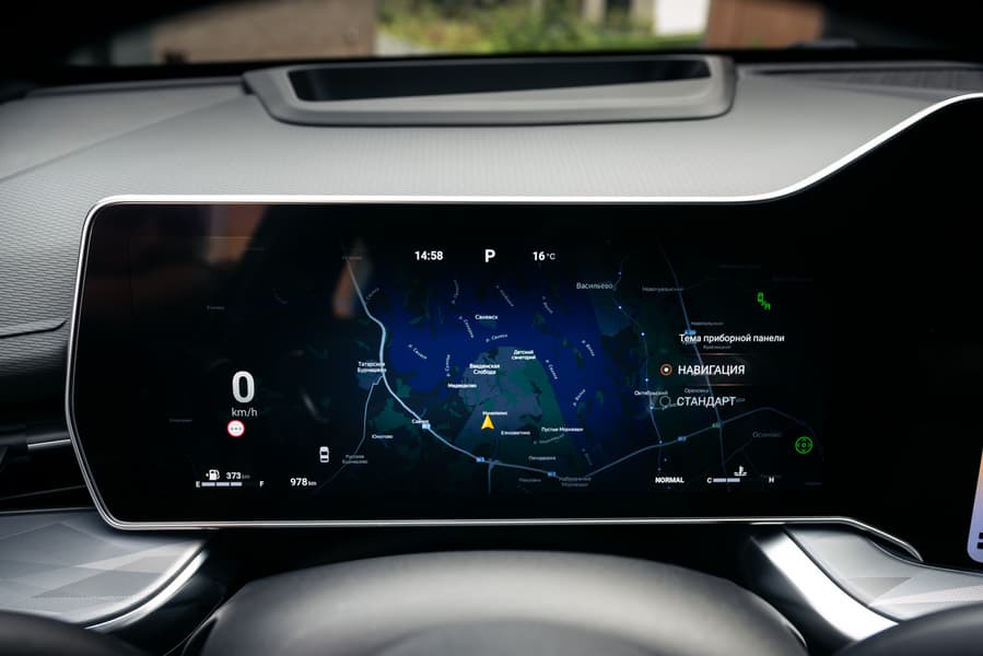Роскошен экран мультимедиа, заметно повернутый в сторону водителя. В хорошей комплектации дисплей имеет диагональ 14,6 дюйма, он быстродействующий и синхронизирован с 12-дюймовой «приборкой». Карта навигации может отображаться и там, и там. Разве что на большом экране чуть больше ситуативной информации, например, транслируются знаки ограничения скорости.