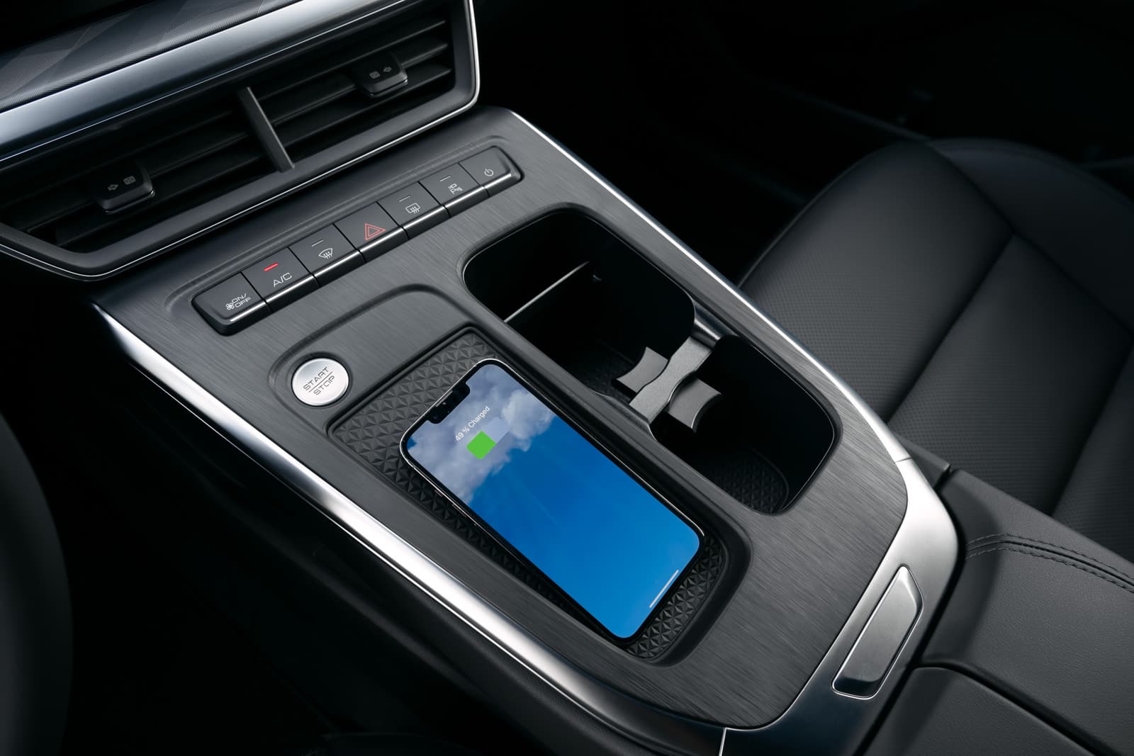 Зато освободилось место на центральной консоли, и там разместились подстаканники с разделителем и площадка для зарядки смартфона. Она (зарядка) небыстрая, всего 15 ватт, зато не требует охлаждения. И вообще, благодаря все той же функции голосового управления, смартфон будет не слишком востребован, заряжать его часто не потребуется.