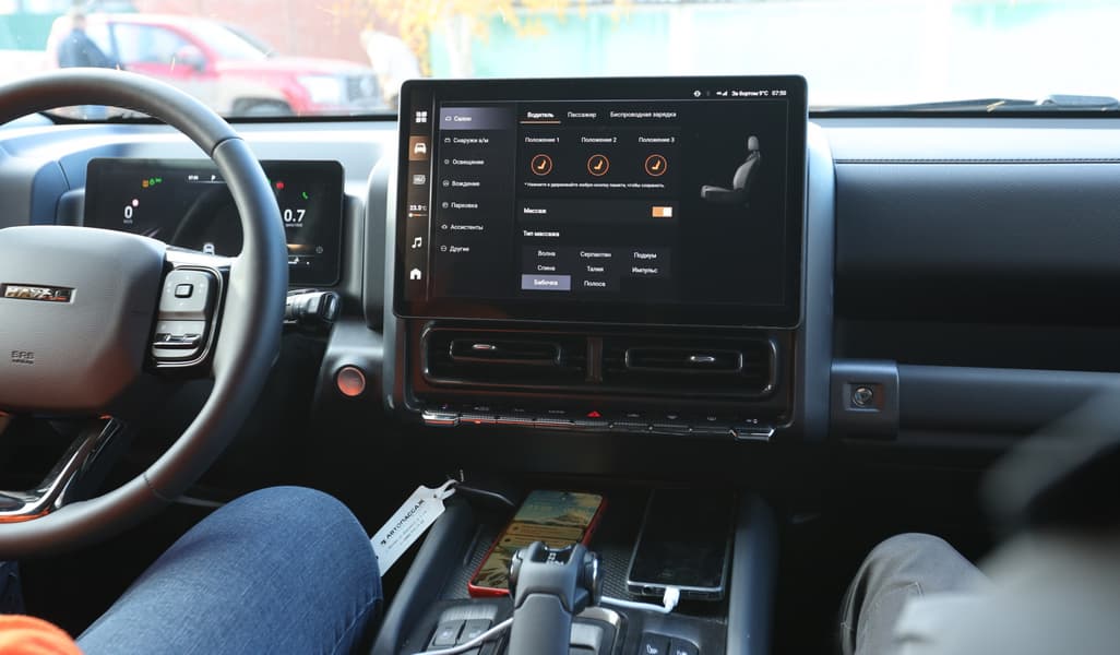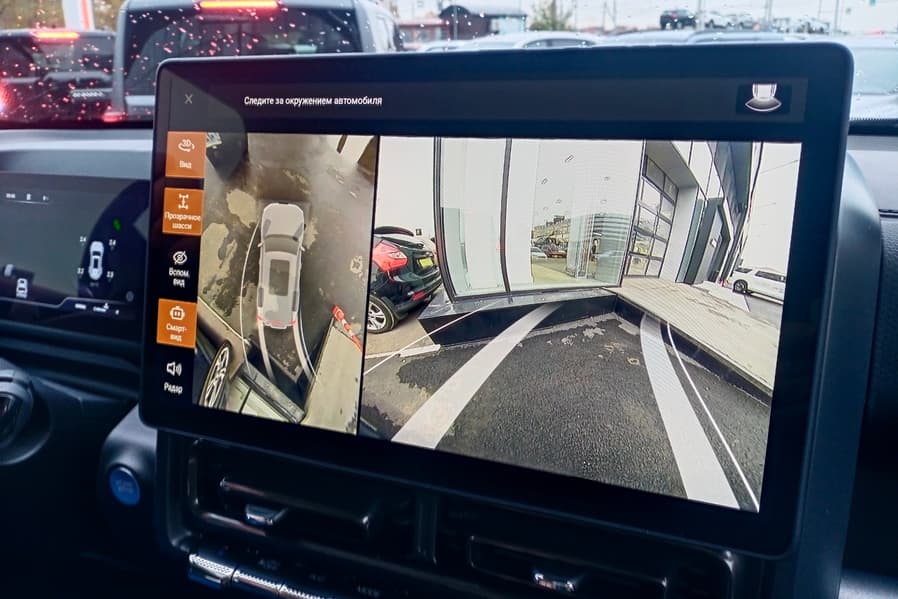 От резкой смены климатических зон начало запотевать ветровое стекло. Исправить ситуацию оказалось возможным, приведя вентиляцию в режим Auto. Но его клавиша по какой-то причине оказалась «зашитой» в меню большого (14,6 дюйма) экрана, и это при том, что что все прочие кнопки системы вентиляции/кондиционирования вынесены в «физическом» исполнении на центральную консоль. Отклик дисплея довольно быстрый, предусмотрен обширный набор настроек, а меню, в общем и целом, понятное. Яркость экрана, понятное дело, регулируется, а вот на солнце он сильно бликует и собирает отпечатки пальцев. Android Auto и Apple CarPlay пока нет. Первый ждут совсем скоро, второй обещают к концу года.