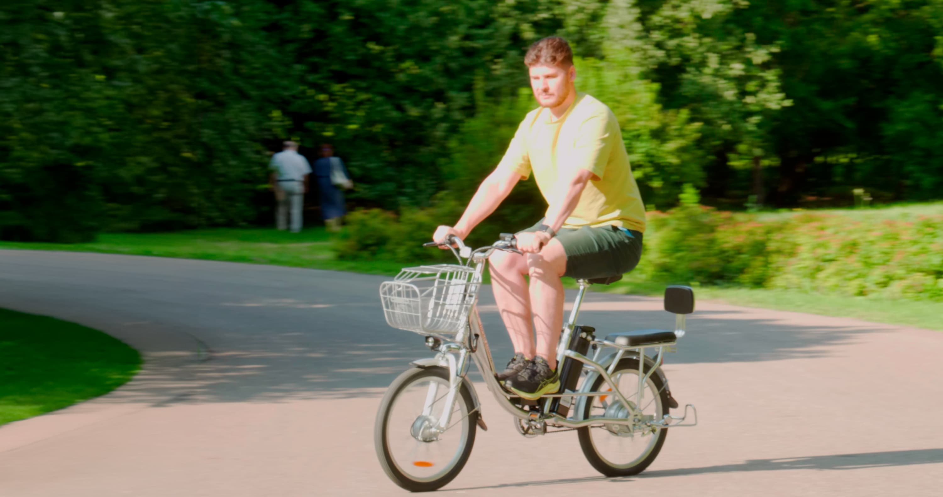 Потому что ехать можно и исключительно на электрической тяге, вообще не помогая ногами, для этого нужно повернуть ручку. Даже не нужно отталкиваться, велосипед сразу поедет, а ноги можно поставить на подставку. Я выше нормативного роста, но у меня колени в подбородок не упирались.