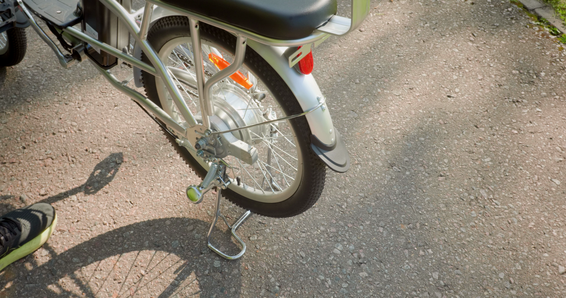Сзади и спереди — по катафоту. Спереди есть еще светодиодная фара, очень яркая, но с «козырьком», так что пешеходов вблизи не ослепляет. Сзади — мощная двухсторонняя подставка.