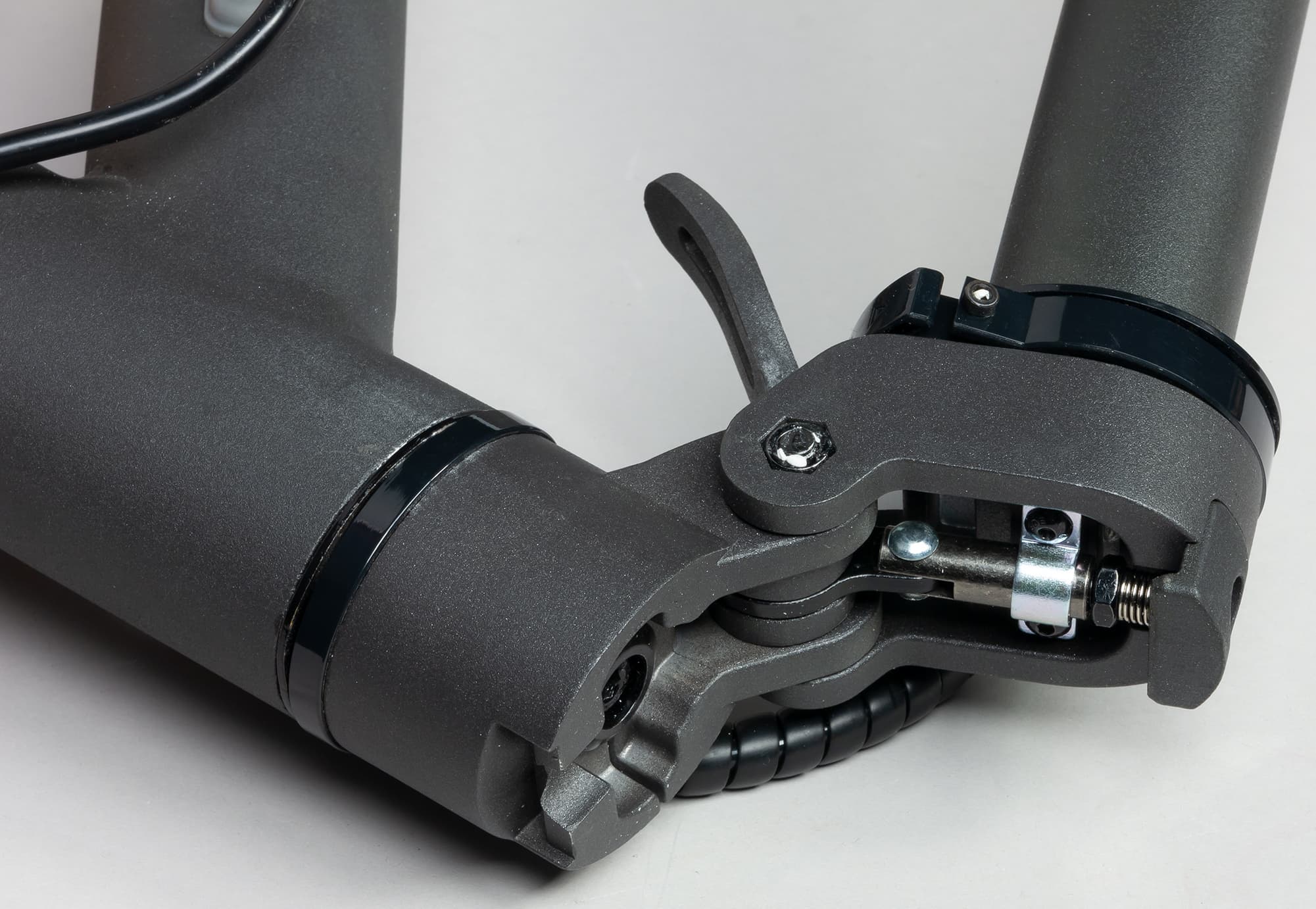 Самокат поставляется в полуразобранном виде — руль придется собрать самому. Верхняя часть руля крепится к «рулевой колонке» при помощи четырех болтов, которые входят в комплект и легко закручиваются шестигранным ключом. Рукояти руля, сделанные из металла и текстурированной резины, также вкручиваются самостоятельно. Высота руля не регулируется.