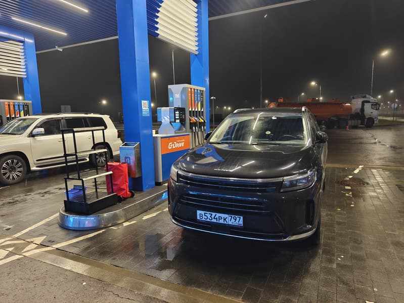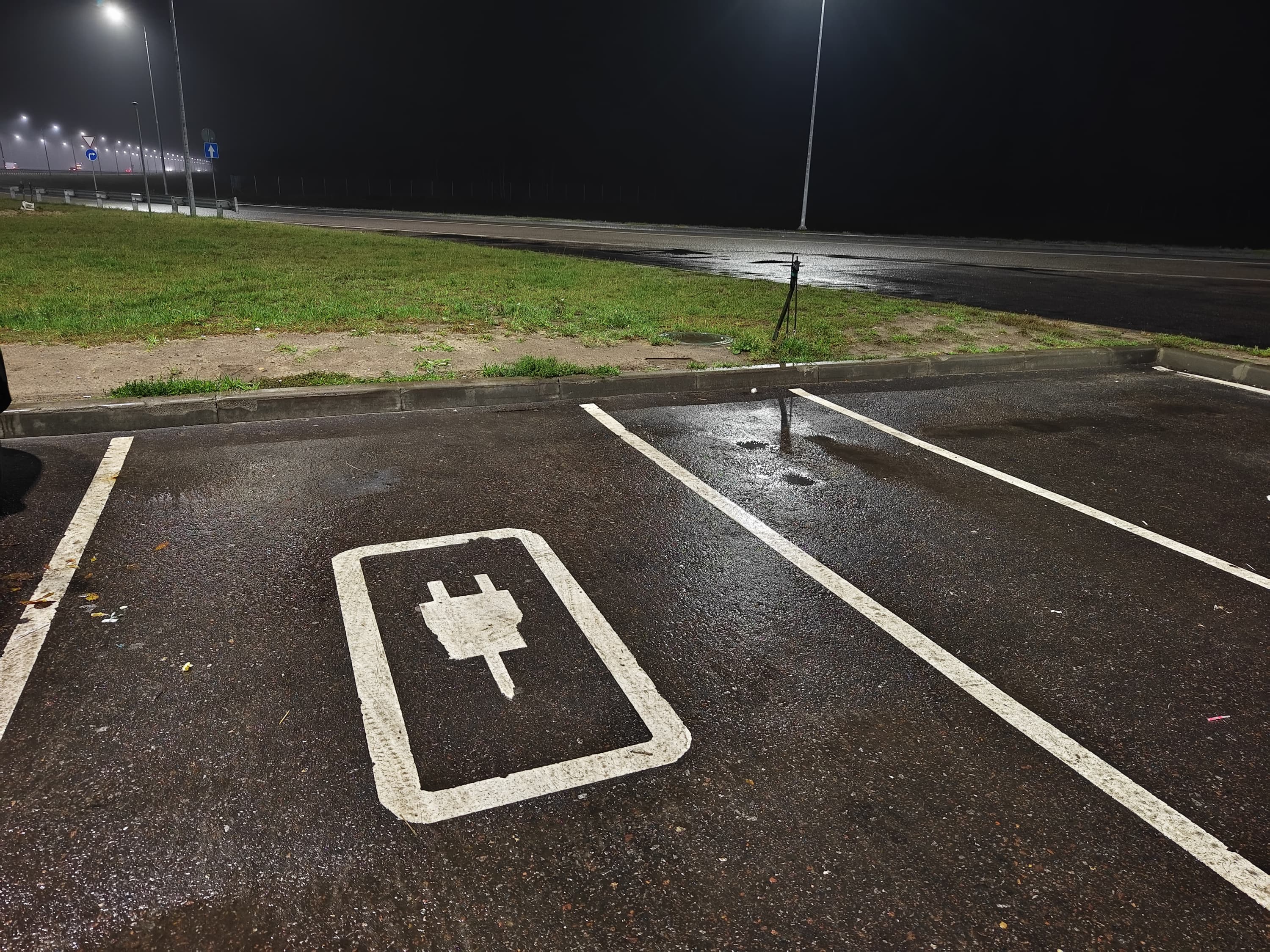 АЗС «Газпромнефть», на которую мы заехали сделать санитарную паузу и перекусить, декларировала на информационной стелле наличие «розетки», но, по факту, располагает пока только разлинованным парковочным местом и выводом голого кабеля.