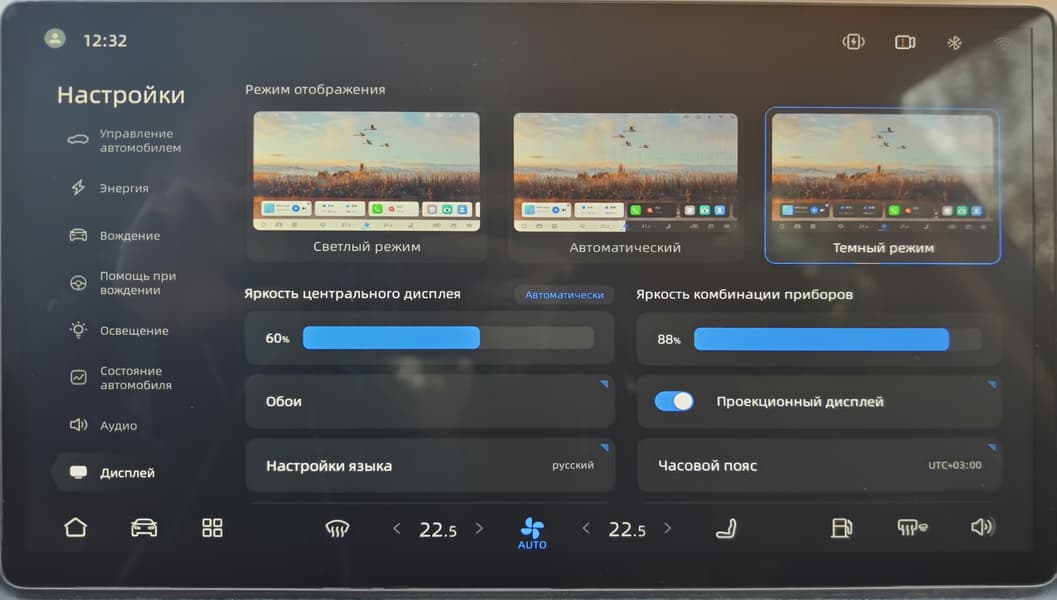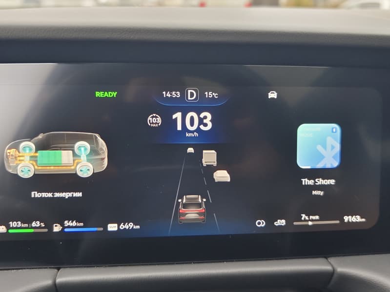 Приборная панель размером 10,25 дюймов расположена удобно. Во время движения по центру отображаются крупные цифры скорости и другая полезная информация. С «приборкой» также можно взаимодействовать, прокручивать и делать её светлой или тёмной.