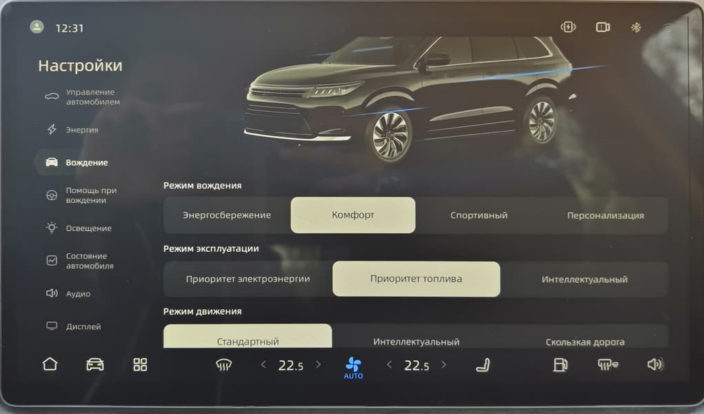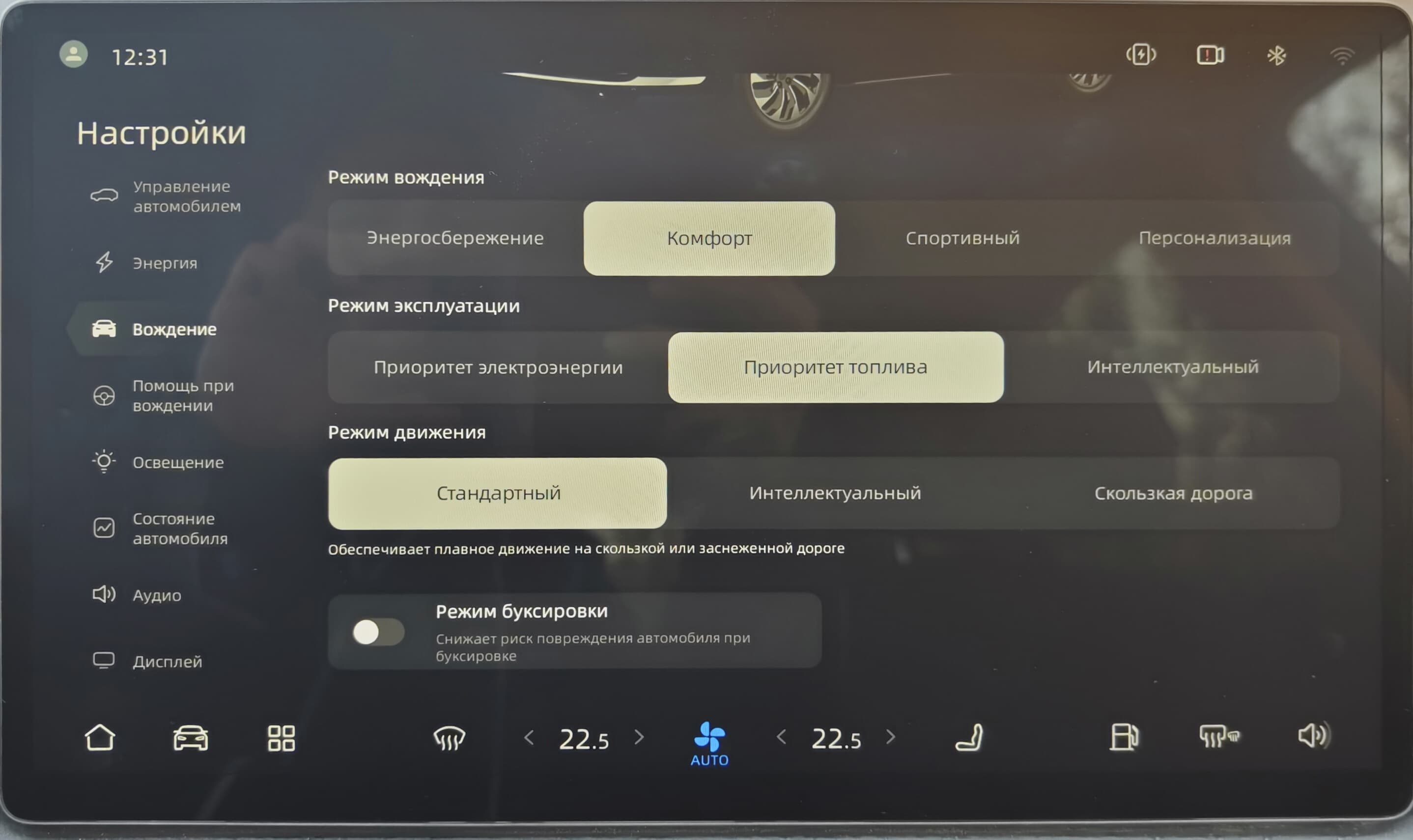 Настройка режима движения автомобиля осуществляется всё также при помощи мультимедиа-системы. Напомним, что бензиновый ДВС в Seres M7 у нас является просто генератором электроэнергии. То есть водитель может выбрать полностью электрический режим («Приоритет электроэнергии»), когда машина будет двигаться только на тяговой батарее, не задействуя бензомотор. Можно выбрать режим «Интеллектуальный», когда бортовой компьютер автомобиля будет определять самостоятельно, когда требуется подключать бензиновый двигатель, а когда можно катиться на электротяге. Либо выбрать настройку, при которой бензомотор будет работать постоянно («Приоритет топлива»), беспрерывно подзаряжая аккумулятор.