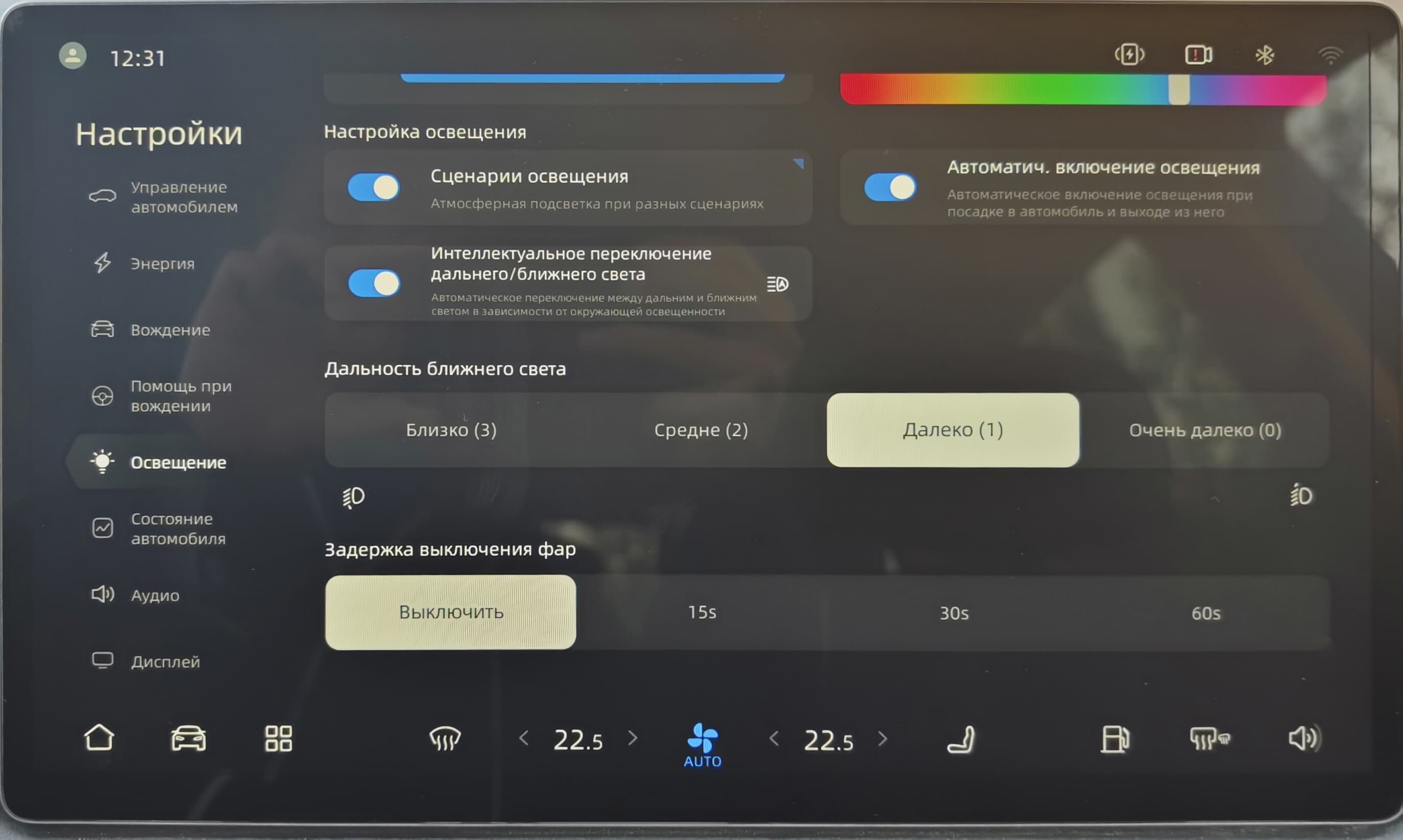 Ну и, конечно же, помимо датчика света, в автомобиле присутствует функция «Проводи меня домой». Настройку, как долго машина будет освещать вам дорогу: 15, 30 или 60 секунд, можно также задать через мультимедийную систему. При желании, габаритные огни можно выключить полностью, даже если вы находитесь внутри «заведённого» автомобиля. Обычная, казалось бы, но нечастая функция у многих современных автомобилей.