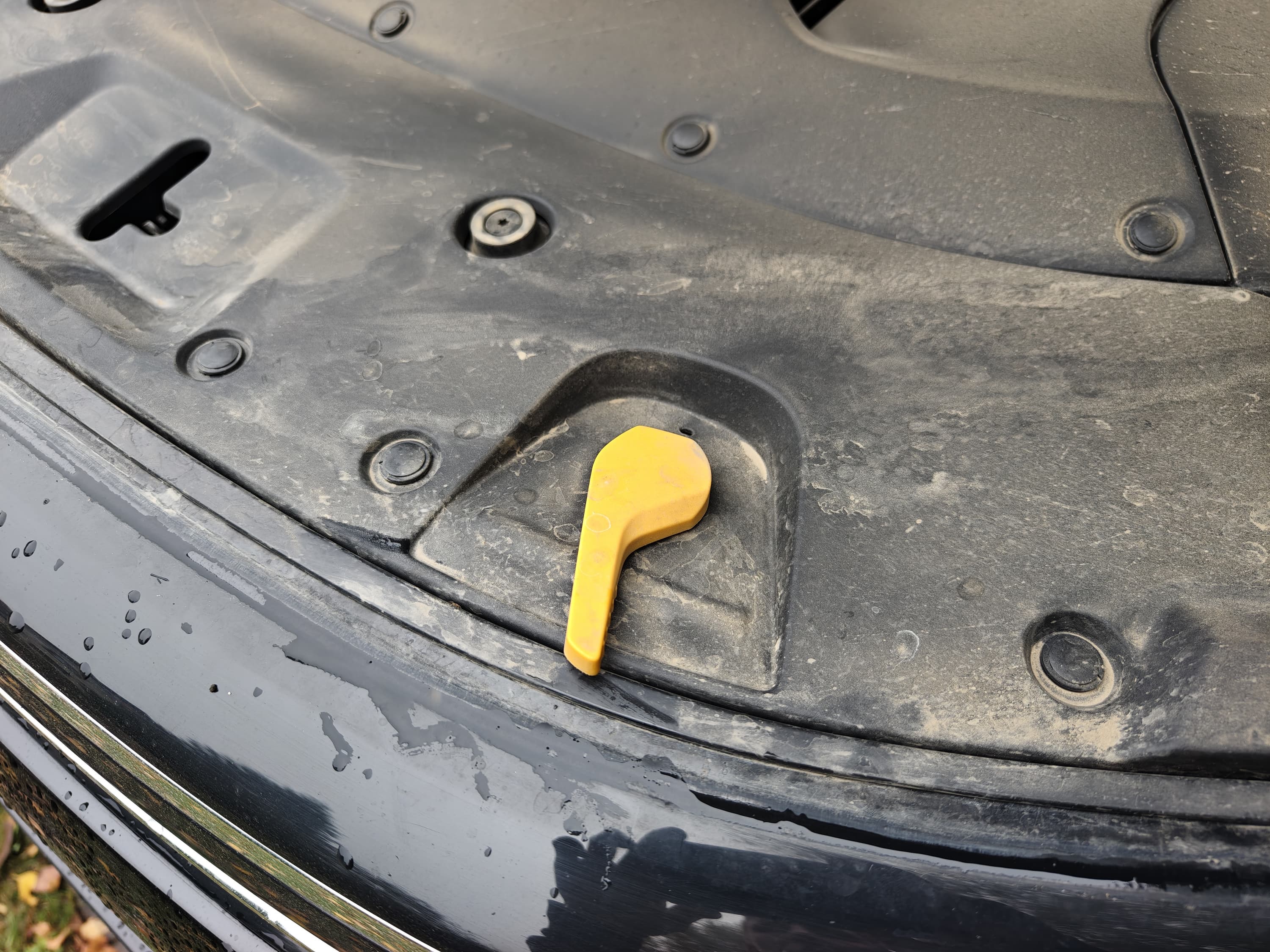Рычажок, открывающий капот найти не так просто. Он основательно утоплен под приборной панелью, практически наравне с рулем. После этого необходимо найти под капотом другой жёлтый рычаг, чтобы разблокировать замок капота.