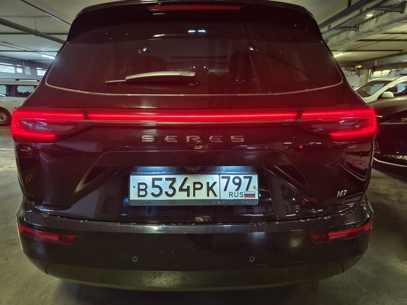Задняя оптика также полностью светодиодная. Seres M7 оснащён «опоясывающим» светодиодным задним фонарём, яркими стоп-сигналами на стандартных местах, включая козырёк над задним стеклом. При движении задним ходом активируются две ярких светодиодные лампочки.