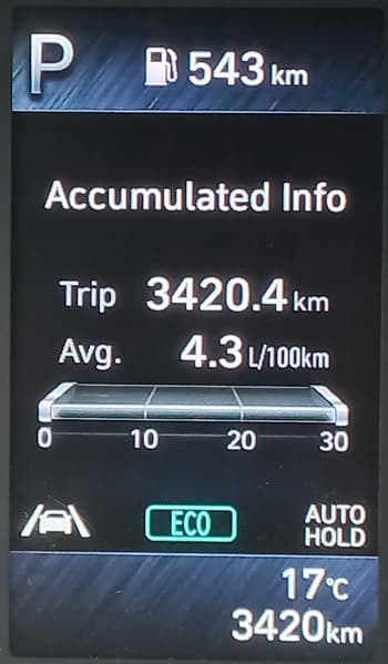 - Сразу после заправки до полного бака перед дальней поездкой (примерно на 500 км в обе стороны). Батарея заряжена почти полностью, только до заправки на ней доехал. Это средний расход за все время поездок.
