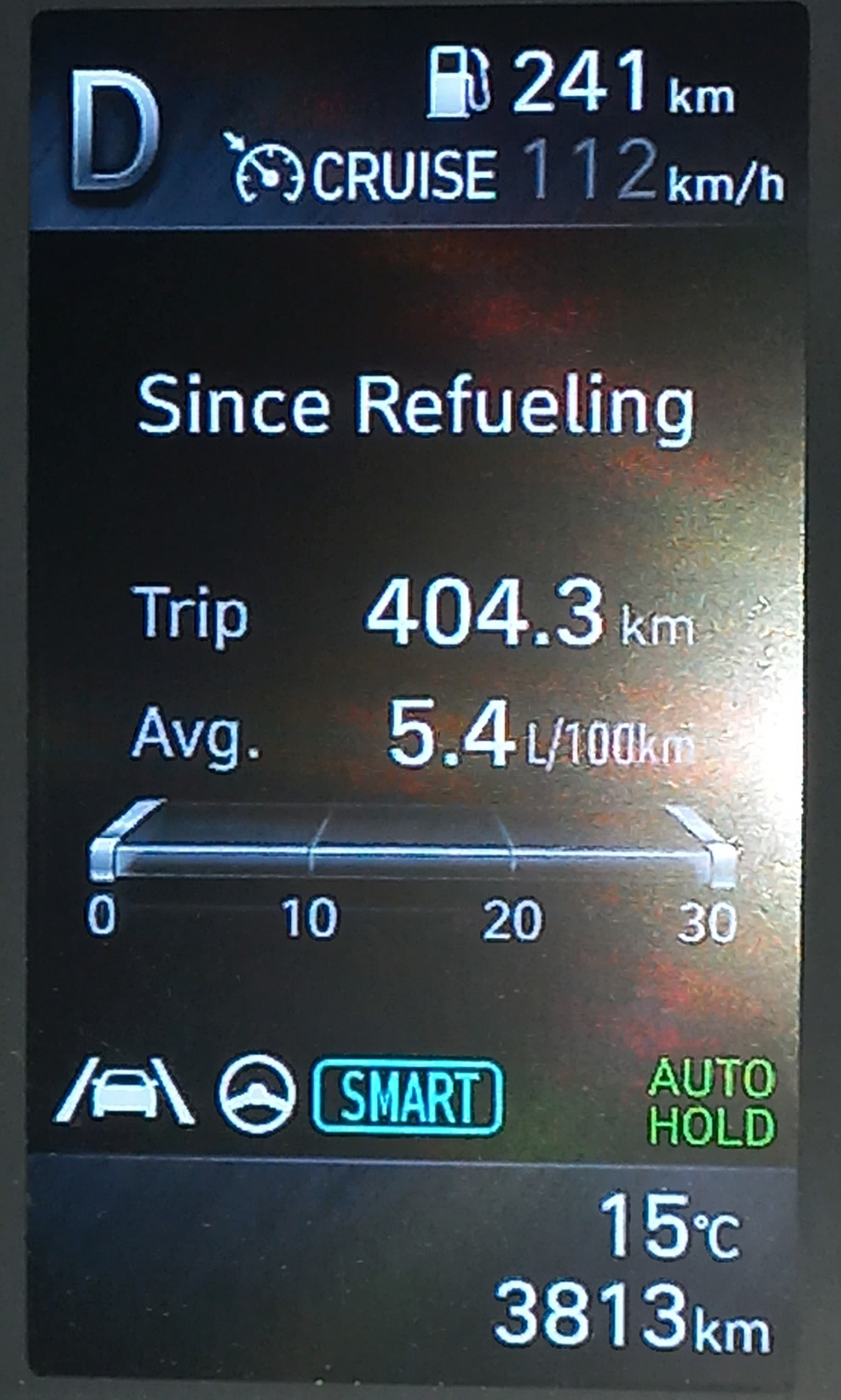 - Перед новой заправкой после этой поездки. Остаточный уровень заряда батареи — примерно 15%, заряд был выбран за первые 50 км путешествия, а далее использовался только гибридный режим. Заправлялся на обратном пути примерно в 100 км от дома. Надеялся, по старой памяти, что будет дешевле, чем на той заправке, что недалеко от дома. Зря надеялся.