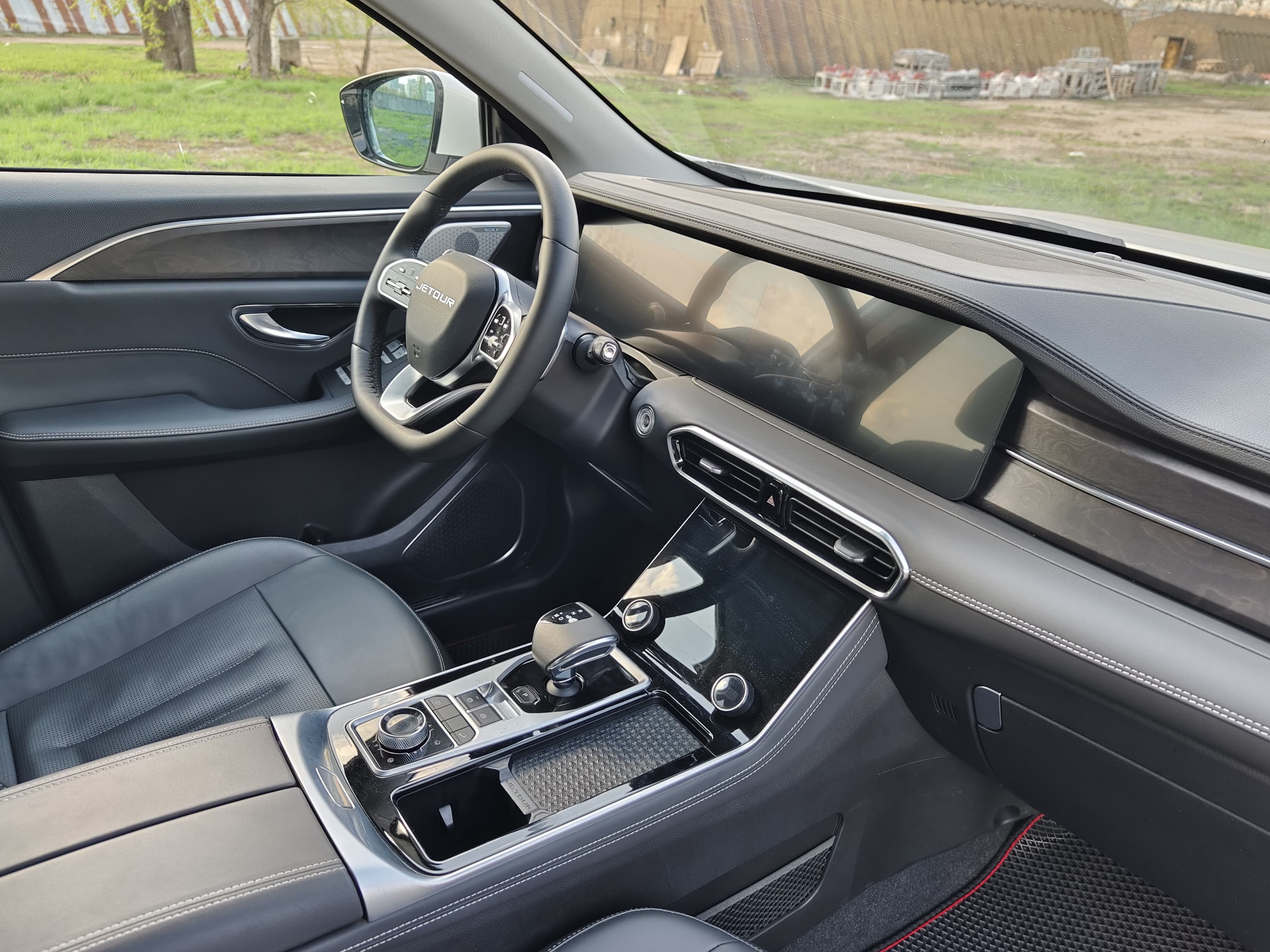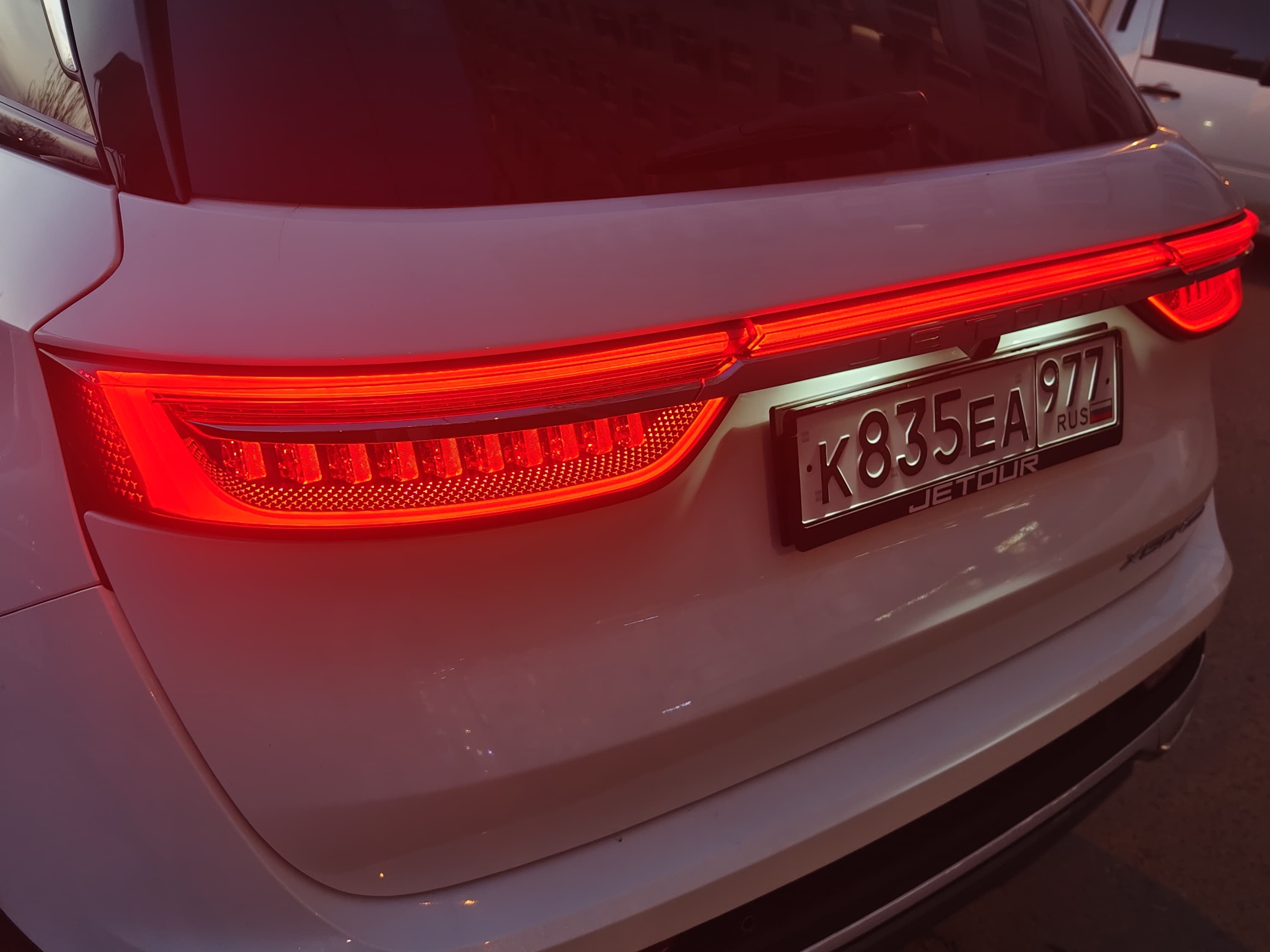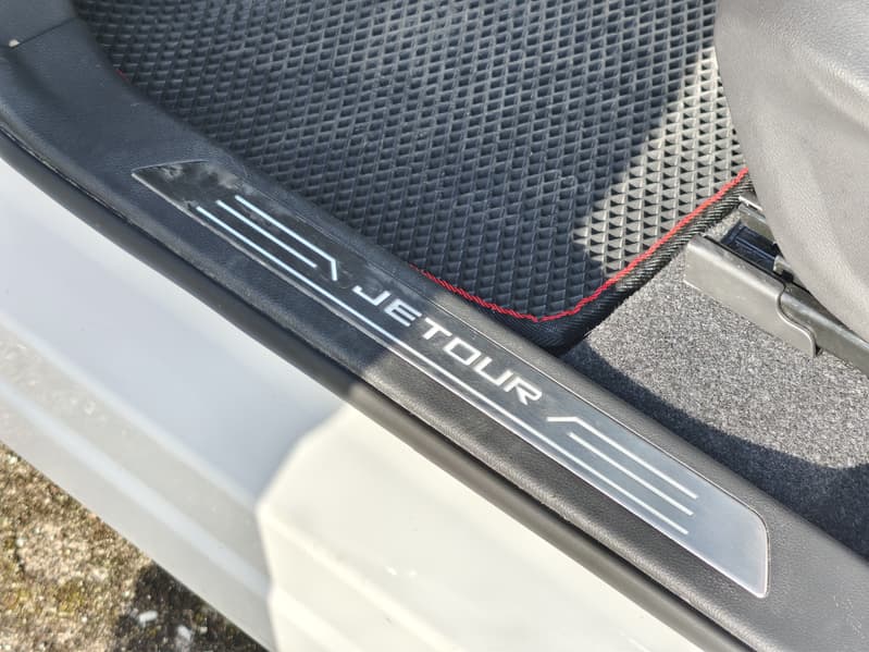 При этом обзорность через пятую дверь не вполне достаточна. Изгиб выштамповки для пластиковой вставки стеклоочистителя ещё больше уменьшает полезную площадь заднего стекла.Остаётся лишь небольшое полезное пространство, расположенное, при этом, очень высоко над бампером. Таким образом, что у водителя нет возможности видеть нос следующего за Jetour автомобиля, если он находится на расстоянии ближе двух-трёх корпусов.