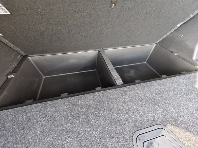 Зато такая компоновка позволила выделить под другие полезные в дороге мелочи сразу три отсека под ковриком.