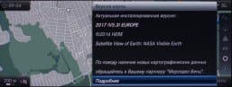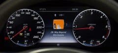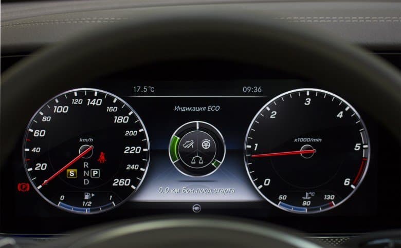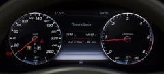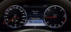 С помощью этой недешевой опции водитель сможет увидеть «парящее над капотом» виртуальное изображение размером приблизительно 21 на 7 см, содержащее важную информацию о движении. Характер выводимой информации можно настраивать. Отметим, что, на наш взгляд, наиболее полезной является информация о состоянии автопилота Distronic, скорости движения и распознанных дорожных знаках. Информация с навигационной системы выводится не совсем корректно, так, обозначения «км» и «м», характеризующие единицу оставшегося расстояния, заменяются характерными для неправильной кодировки «кракозябрами». Часть названий населенных пунктов выводится кириллицей, часть — латиницей.