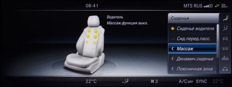 На экране головного устройства отображается графическая визуализация процессов настройки сиденья, а также массажной функции в процессе ее работы.