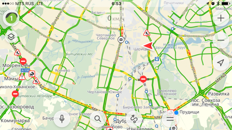 - Встроенная система информирования о дорожной обстановке работает в Москве не лучшим образом. Например, в утренний час пик значительный участок МКАД на карте не содержал вообще никакой информации о дорожном движении. Для сравнения приведем скриншот приложения Я.Карты, сделанный в то же самое время.