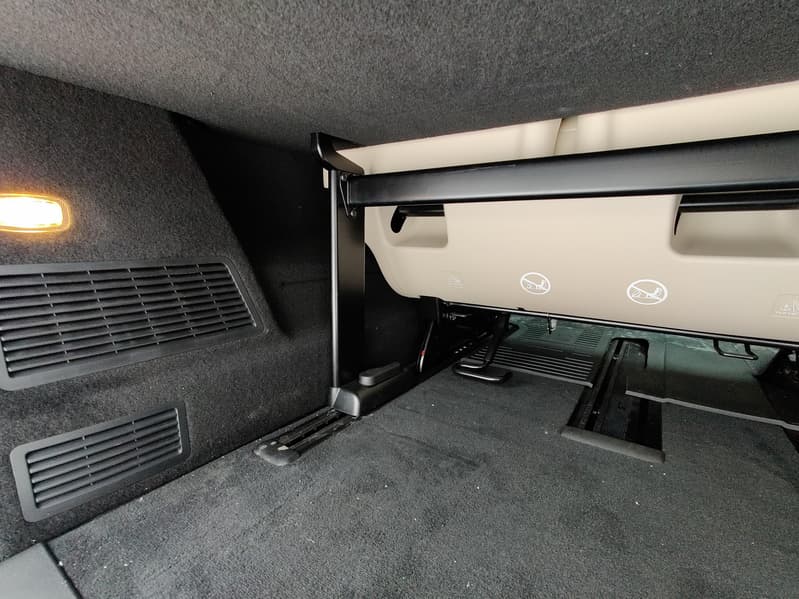 Мы получили возможность коротко познакомиться с XL-версией, в которой был создан офис для комфортного нахождения всего двух людей. Данный автомобиль использовался как переговорная на колесах для больших серьезных людей в условиях коронавирусных ограничений. В перегородке между водителем и пассажирским отделением был вмонтирован монитор большой диагонали, с возможностью подключения ноутбука с места одного из пассажиров, а комфорт переговоров обеспечивала хорошая капсульная кофемашина. По словам предыдущего владельца, как «достаточно стандартная» опция была возможна установка мини-бара.