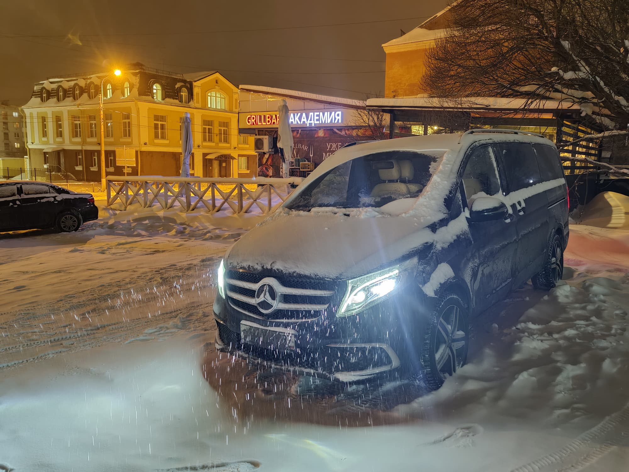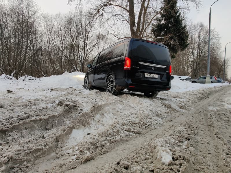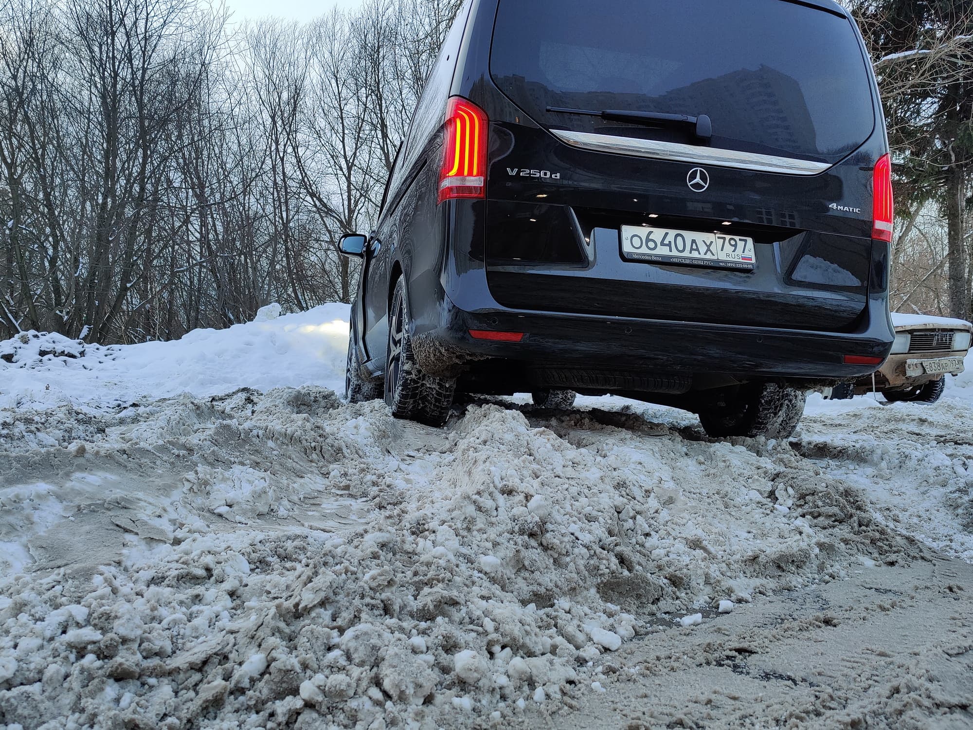 Mercedes-Benz с легкостью заезжает на заснеженные участки с рыхлым снегом. На фотографиях это плохо видно, но V250 спокойно забрался на нерасчищенный участок парковки, куда только что не смог заехать полноприводный X-Trail.